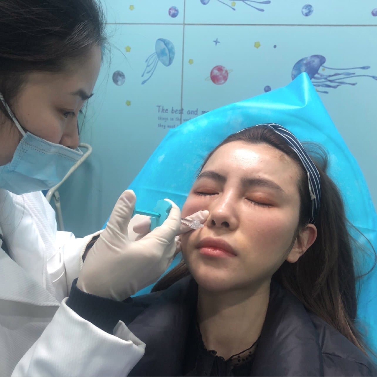 😃进入注射室,给我注射治疗的秦主任过来,给我分析了面部的情况,精准的指出了我面部存在的问题。护士小姐姐给我看了体验的2支姣兰玻尿酸。😛这款玻尿酸才用低温二次交联技术,能很好的减少交联剂的残留,可以被吸收无残留。超柔软的玻尿酸,非常适合眼部、唇部、面部的填充,十分的柔软自然。医生给我做了面部消毒,准备开始注射了。我的诉求是法令纹和面颊的填充,特别是右边的法令纹明显,脸颊缺失也明显。注射过程中有一点点疼痛,但在可以忍受的程度,打完凹陷缺失的部位瞬间爆满起来了。