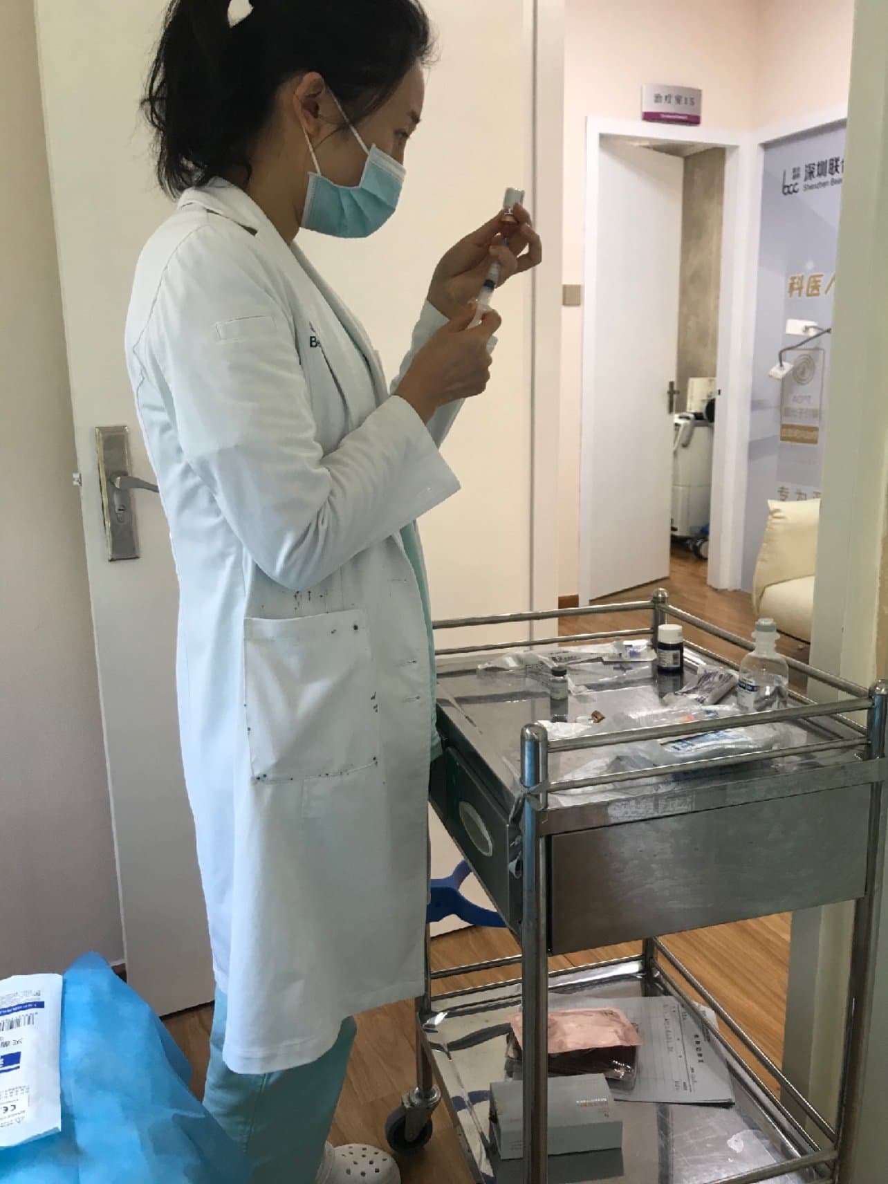 到了之后,首先会给我安排敷麻药,大约30-40分钟之后,操作人员就带我去操作室啦。虽然不是第一次打水光针,但是还是有点害怕!全程闭着眼。医生调配好水光针剂之后我就躺下,帮我卸麻药,消毒,涂碘之类的,接下来就是用机器打了。从右边眼周开始,再右边脸,左边眼周,左边脸,下巴,人中,额头,感觉打的还算比较均匀。唯一不开心的是敷完麻药鼻子红了,医生怕我敏感就没打鼻子,好难过,我的草莓鼻😔😔😔