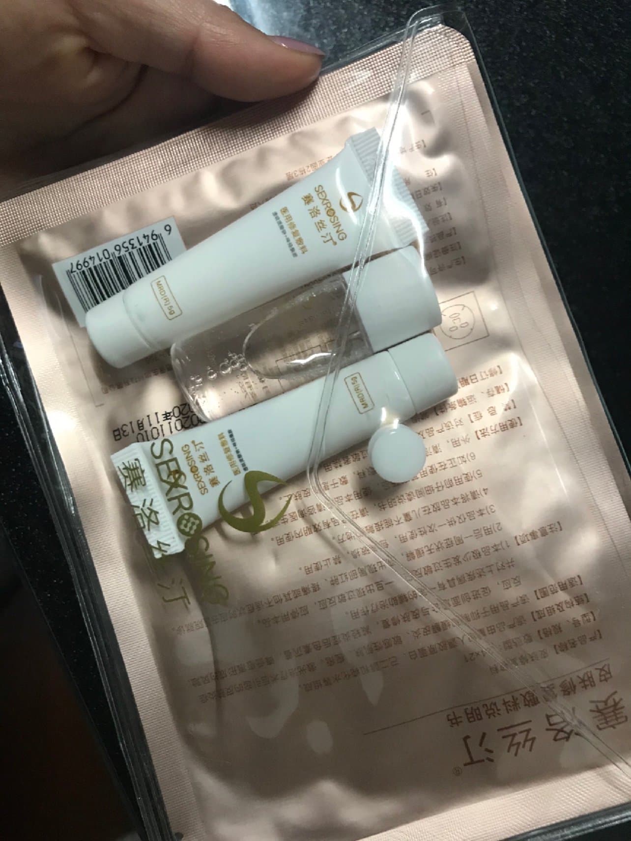 最后,还有小礼包拿,有两片面膜,一瓶水,两瓶乳,刚好可以这几天敷。希望针孔快快消失,美丽快快回来吧!