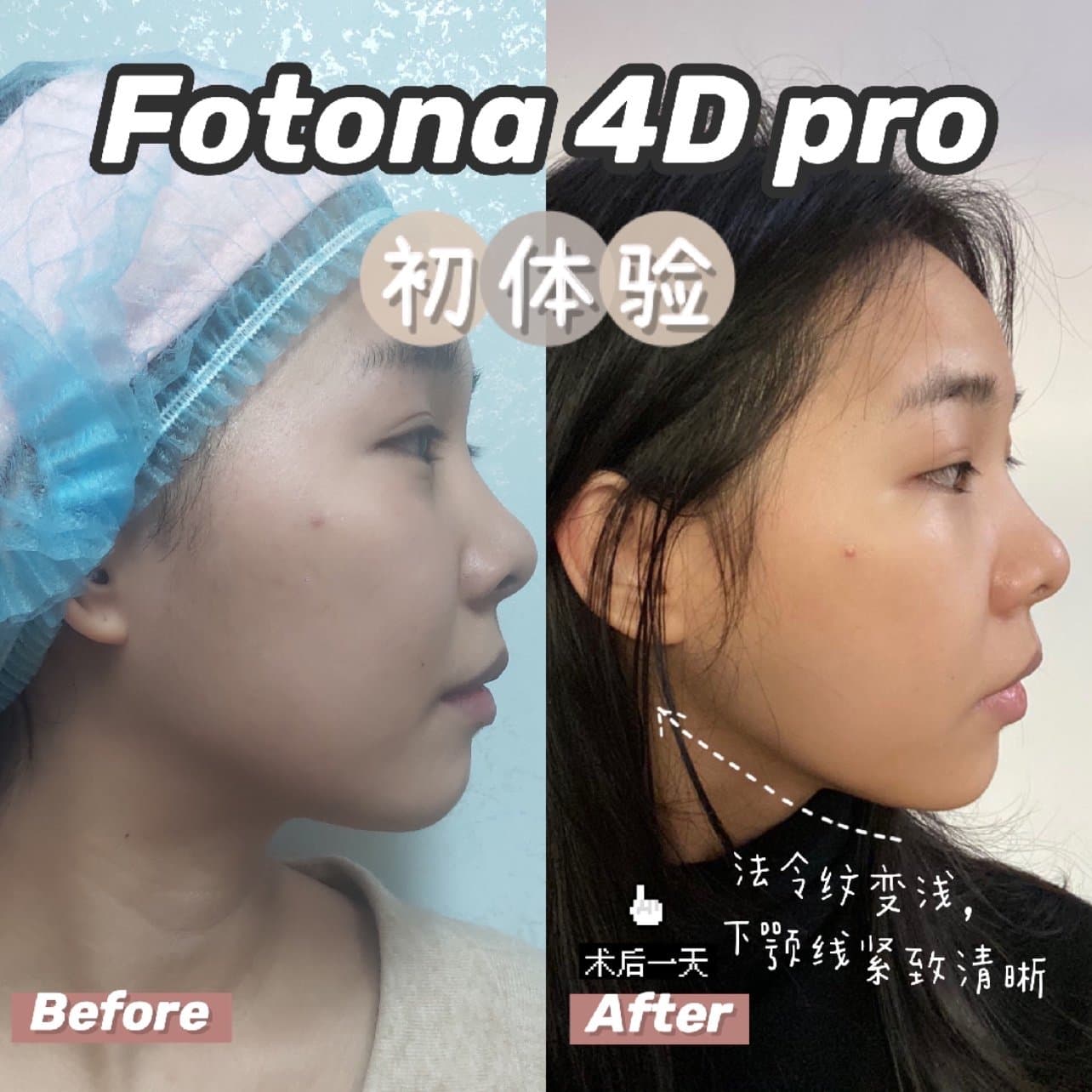 身为30 得老阿姨,因为工作原因经常熬夜对电脑,胶原蛋白流失的特别快,而且我的脸中凹陷比较严重,形成了苹果肌下垂,脸颊松弛,法令纹和泪沟也特别明显,抗衰对我来说真的很重要。之前有做过功课对fotona4D pro也有了解,所以这个体验真的太适合我了!