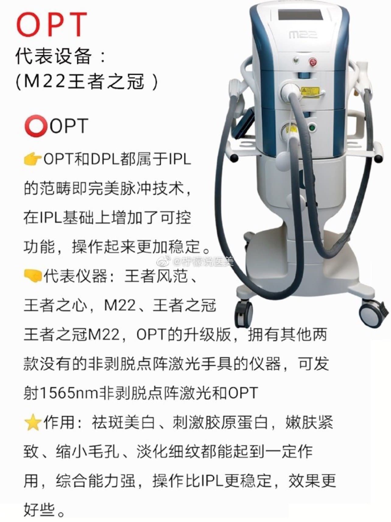 这里就要科普下,M22其实是光子嫩肤的一种,属于强脉冲光原理,它拥有最新一代OPT技术,是IPL、DPL的升级技术。通过用宽频可见光照射肌肤,在肌肤深层产生选择性光热作用达到美肤效果。医生根据不同诉求,使用不同波段的光子,可以分别达到包括祛斑、去痘、去红血丝、脱毛、收缩毛孔、淡化细纹等的不同效果。