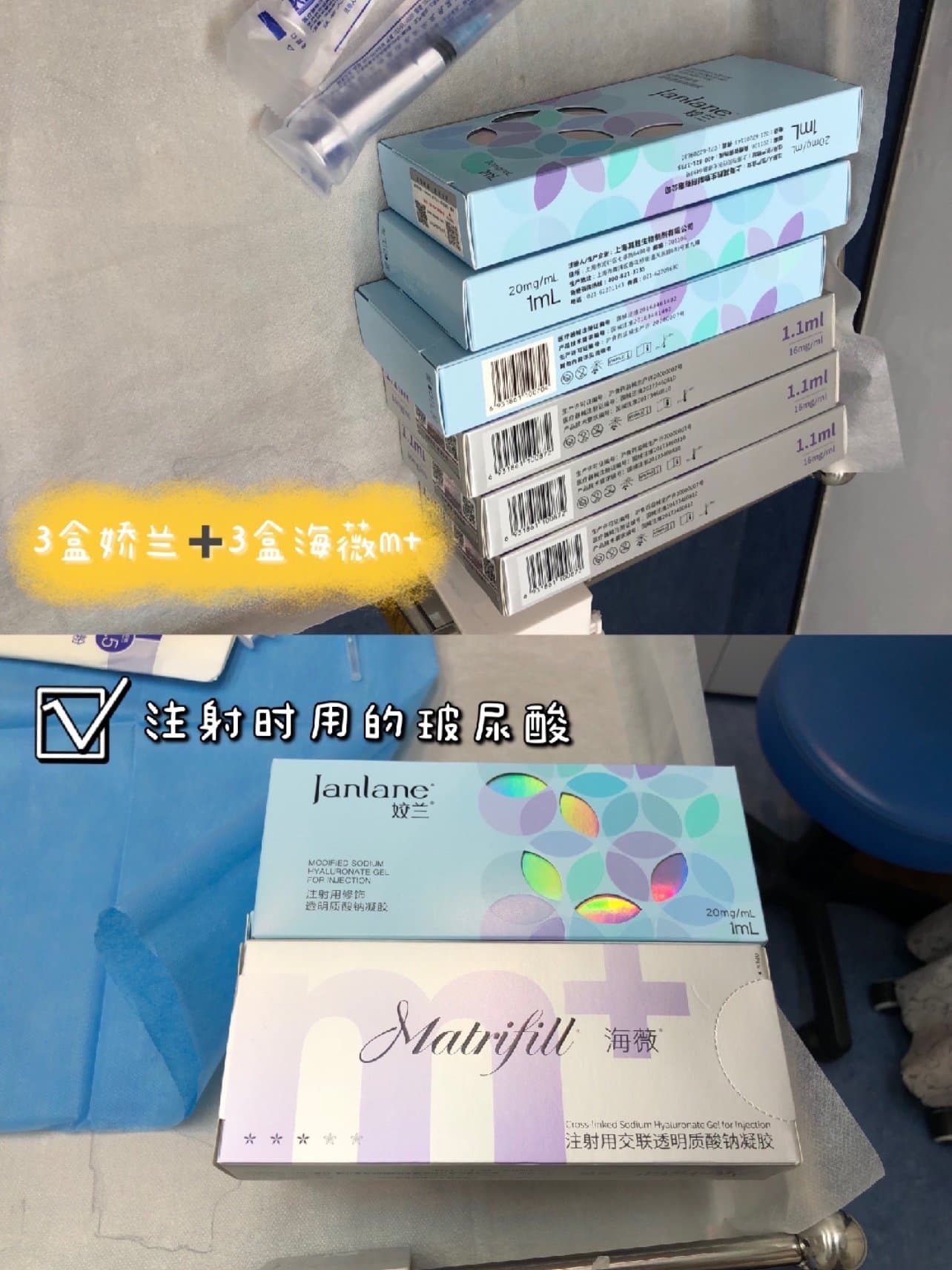 💗💗终于可以面诊注射医生啦!是个女医生,并且她真的好温柔啊!我说了自己的诉求,想要改善泪沟、法令纹🧐🧐医生告诉我说,第一眼觉得我太阳穴的部位也有点凹陷,并且下巴衔接也不太好,会感觉下巴有点脱节的感觉,建议我在下巴衔接的位置也注射一点,上唇的唇珠感也不明显,和下唇不太搭,因为我的下唇比较厚,所以医生说剩下的玻尿酸可以注射唇珠!给我的方案是6只玻尿酸!👉👉分别是大分子海薇m 和姣兰玻尿酸!