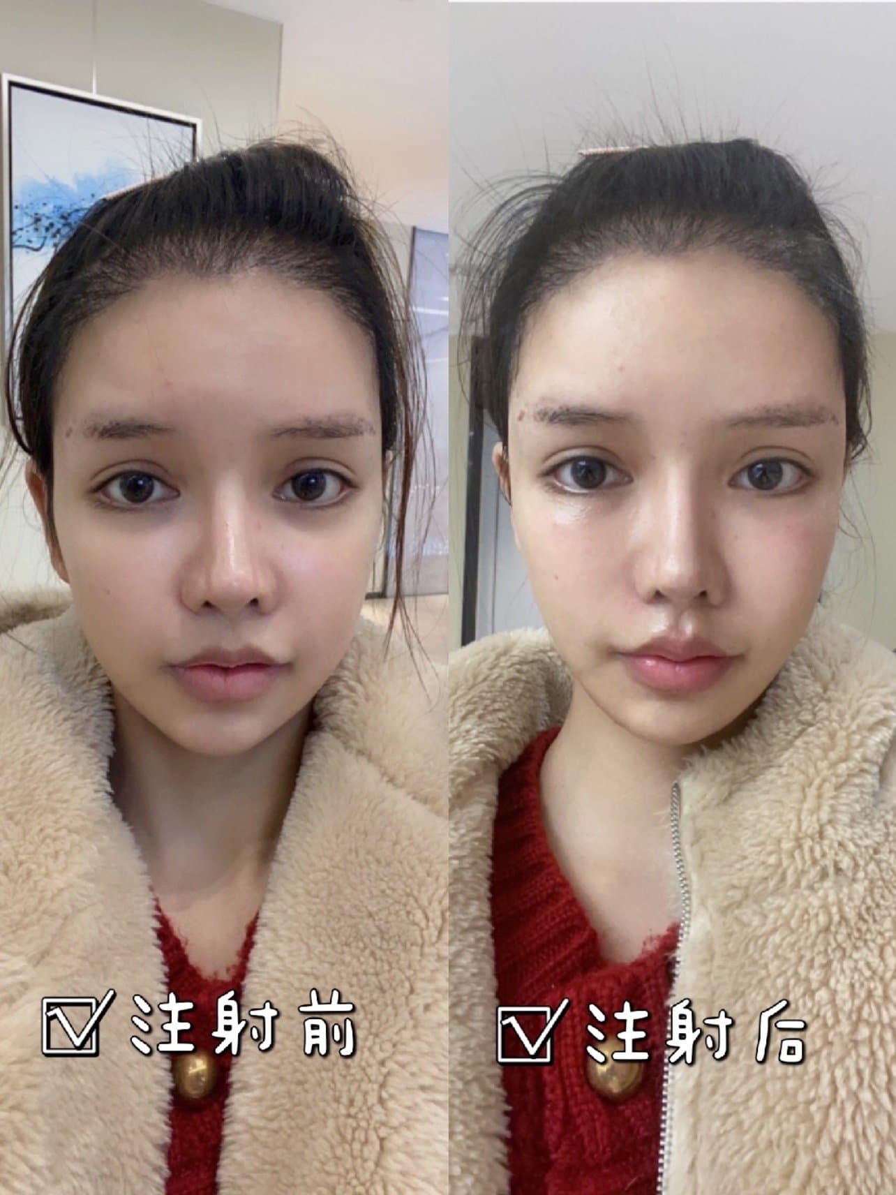 不得不夸奖,海薇m 和姣兰的玻尿酸,在注射完之后完全不红不肿,也没有淤青!在注射完之后,医生交代了注射后的注意事项!回家后,妈妈完全看不出来我注射了玻尿酸,就只是觉得我变精神了😂😂毕竟有泪沟真的很憔悴!
