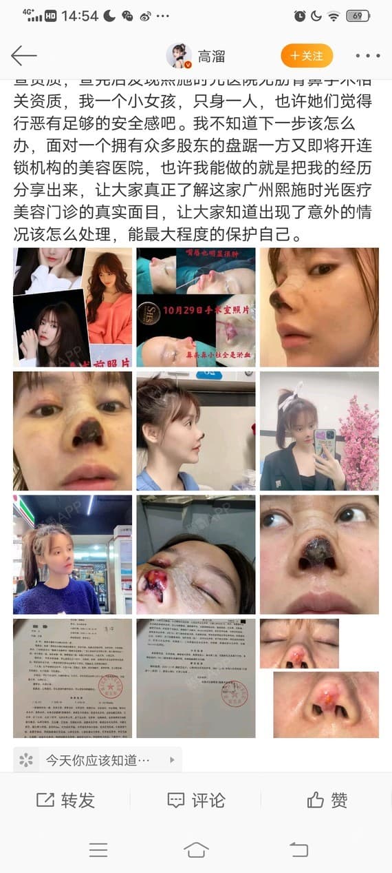 我精简了下:2020年10月29号,经过朋友介绍在广州熙施时光医疗美容门诊做了肋骨鼻部多项,术后开始出现排异反应,发炎刺疼,医院在接下来几天时间让高溜留院观察,直到鼻子鼻头鼻尖开始发黑,医院不得已在11月1号---4号进行了2次鼻子手术,可是情况没有好转,鼻尖鼻小柱颜色越来越黑,鼻头坏死,11月5号 广州熙施时光终于没有办法收拾烂摊子,把高溜转院到广州南方医院进行治疗。可是已经错过了最佳治疗时间,鼻子再也无法回到以前的样子……