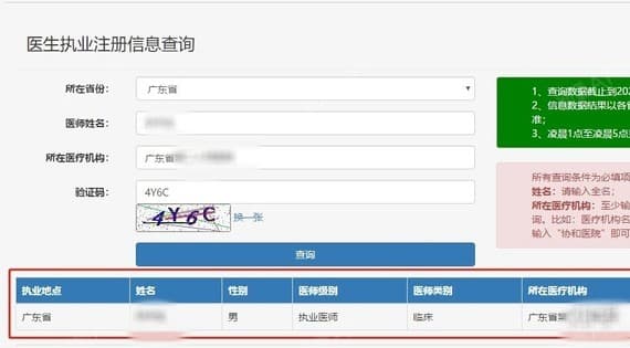 输入医生所在机构的省份、医生姓名、医疗机构、验证码吗,点击查看,可以看到医生执业范围。