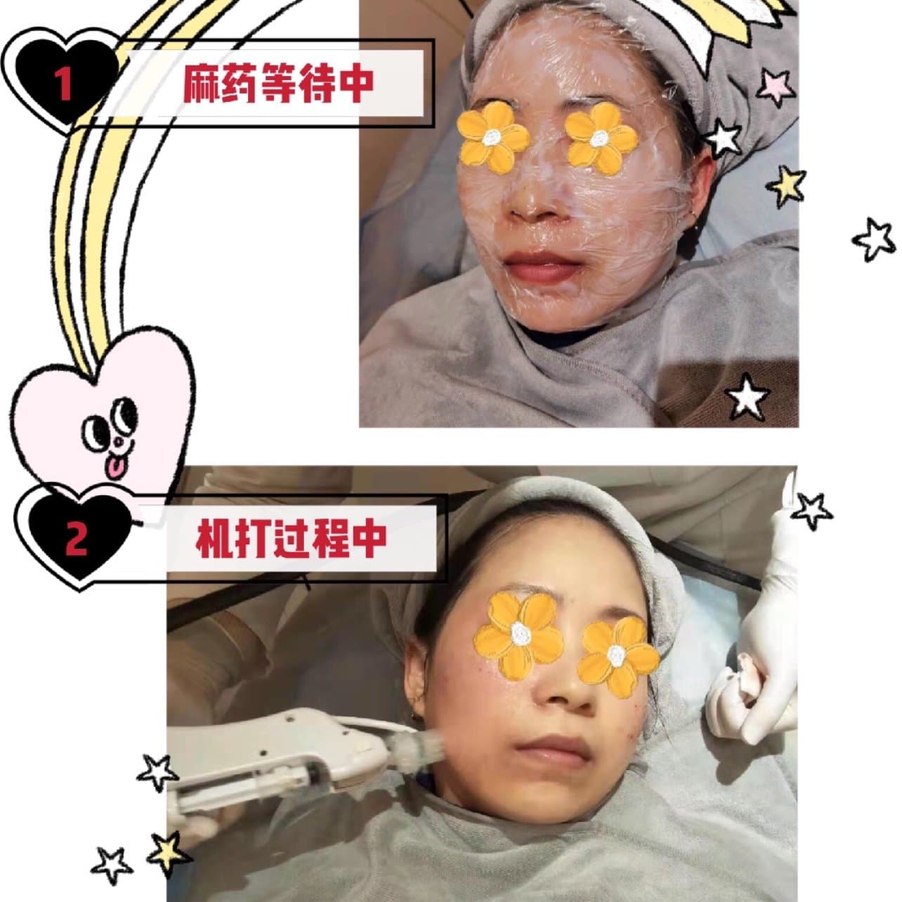机打没啥痛感,全程下来10分钟左右就搞定了。做完之后脸上有明显的出血和针孔,全脸泛红,过一会儿就好了。
