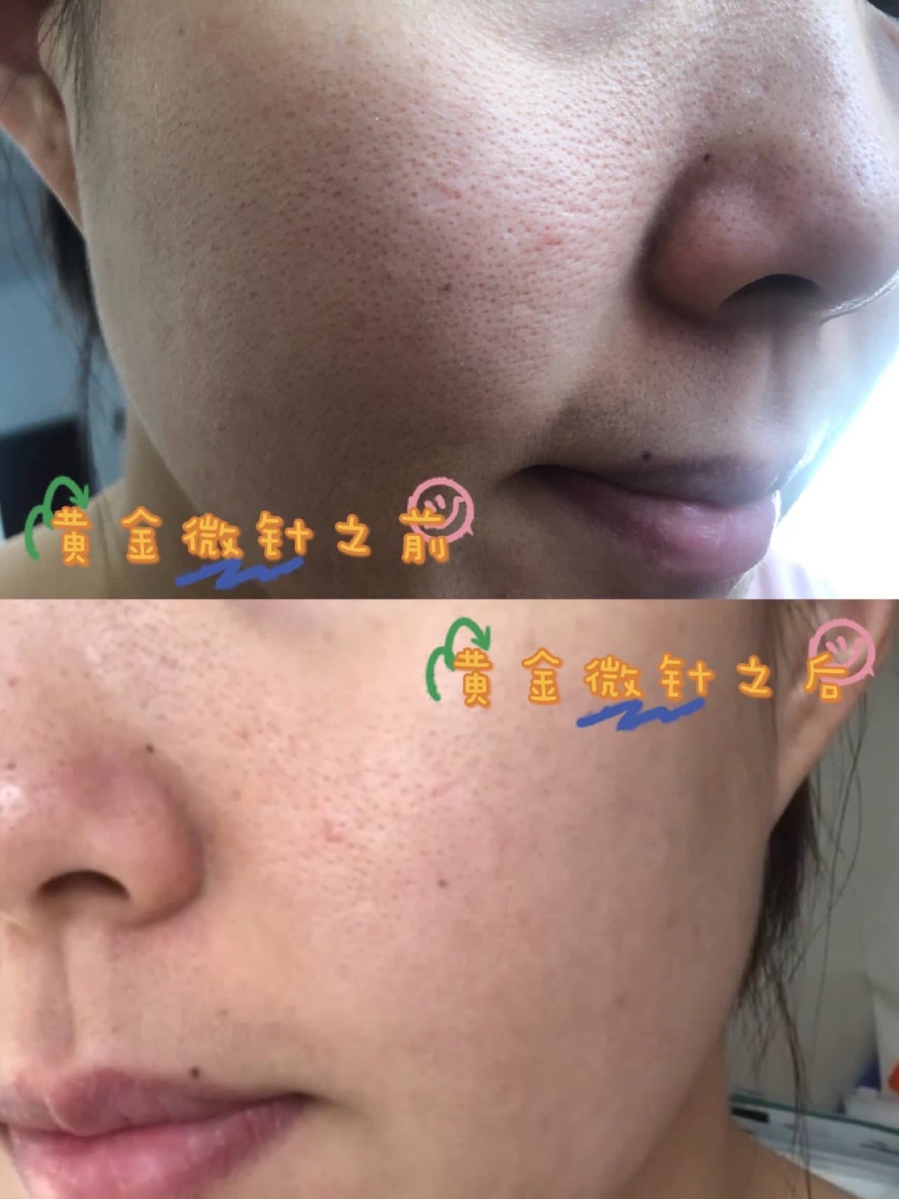 💐脸颊上的毛孔小了很多。但是鼻子上的毛孔依旧还是那样。整体脸部的出油情况好了很多。毕竟黄金微针是按疗程来做的。做一次的话不能起到非常明显的效果。大概三次以后才能有真正收缩毛孔的效果。