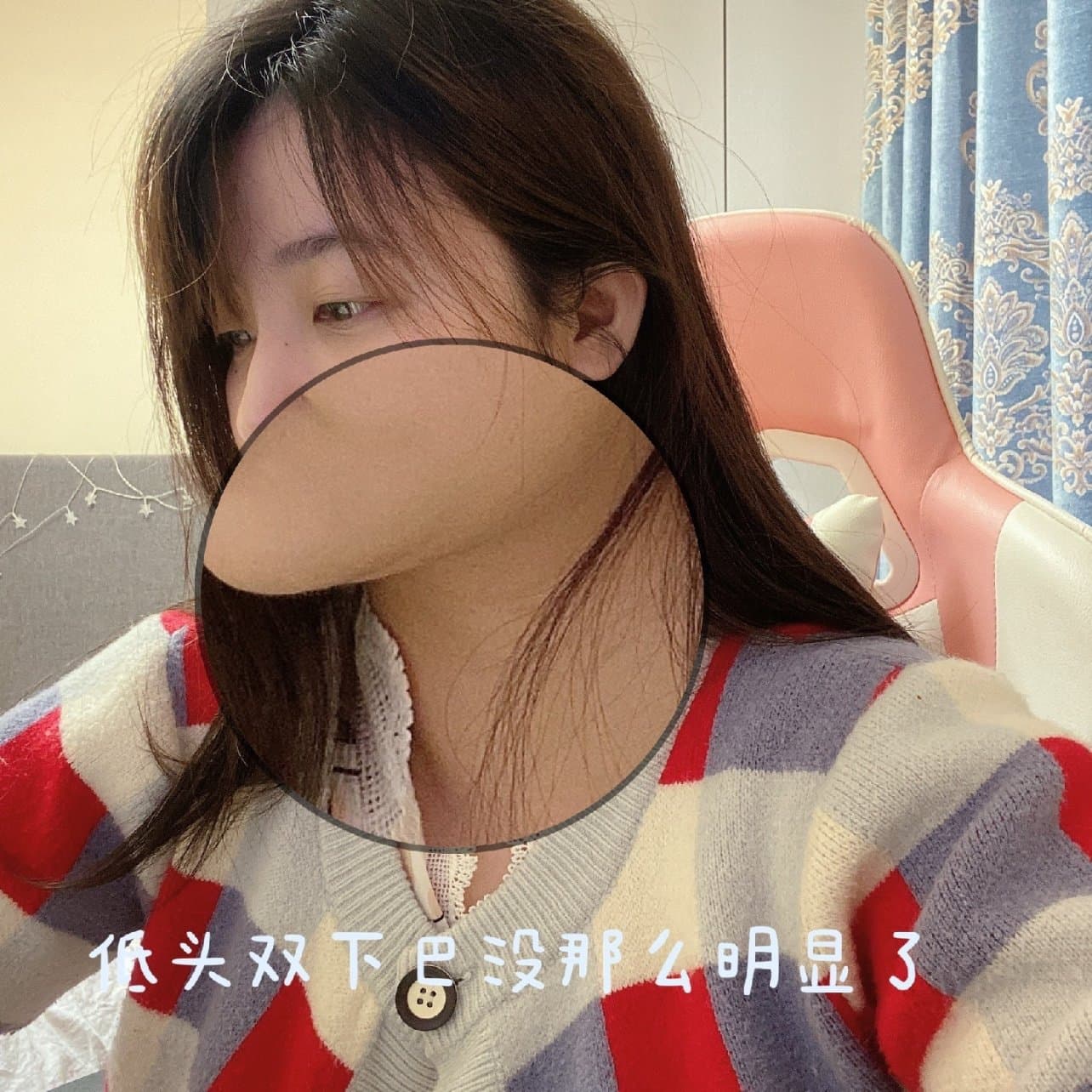 虽然还处在恢复期,依旧能看出来效果!第一张图是从下向上拍摄的角度(手术前),后面低头的照片双下巴小了很多!!可能照片不能很好的表达,作为本人可是太满意了!!期待完全恢复好的效果[:6]