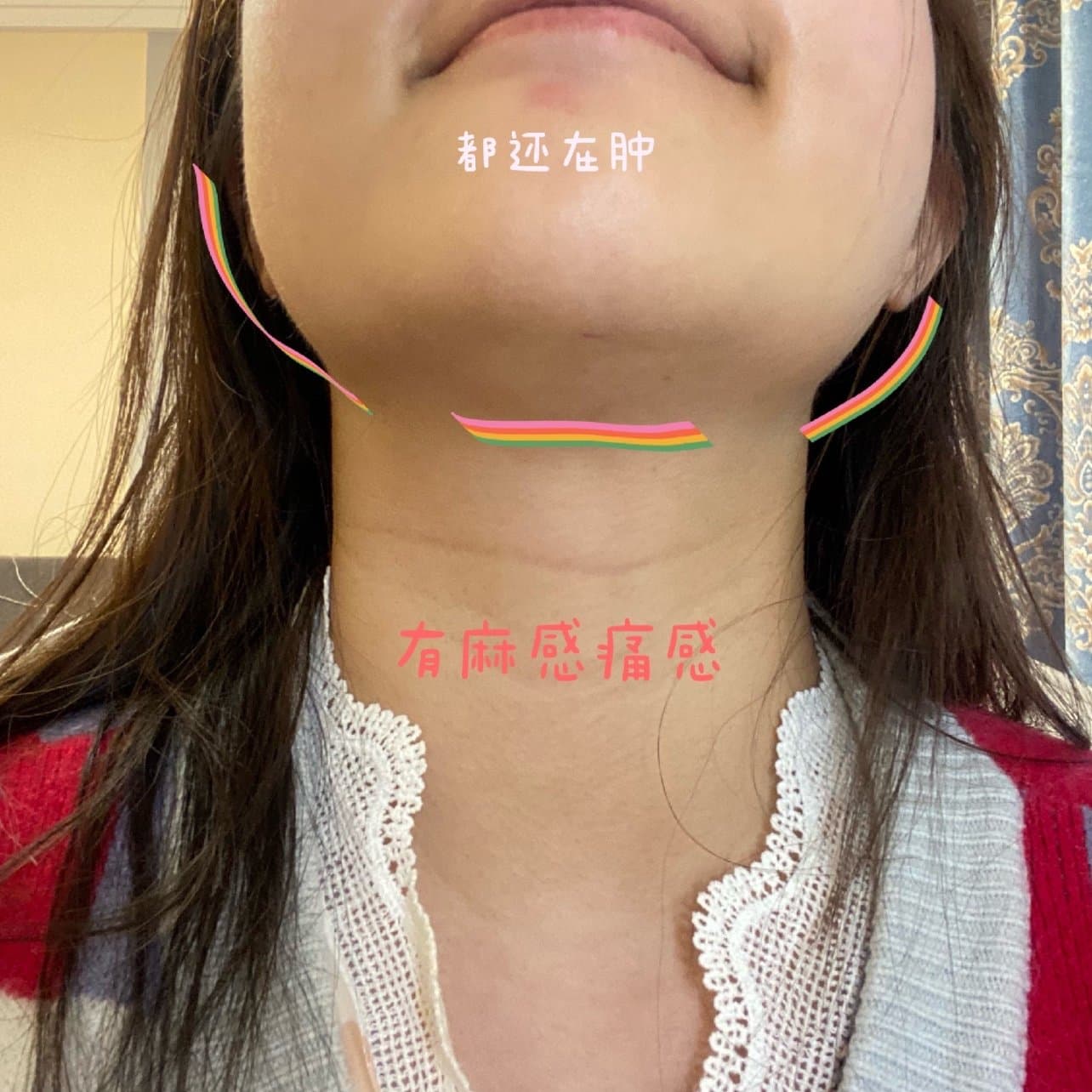 首先我体验的是下颌缘 双下巴,目前手术部位恢复了一些,但还是有麻麻的感觉,右侧嘴角和下巴脖子连接处的硬块也没有消失,洗脸的时候可以感觉到还没有完全消肿。