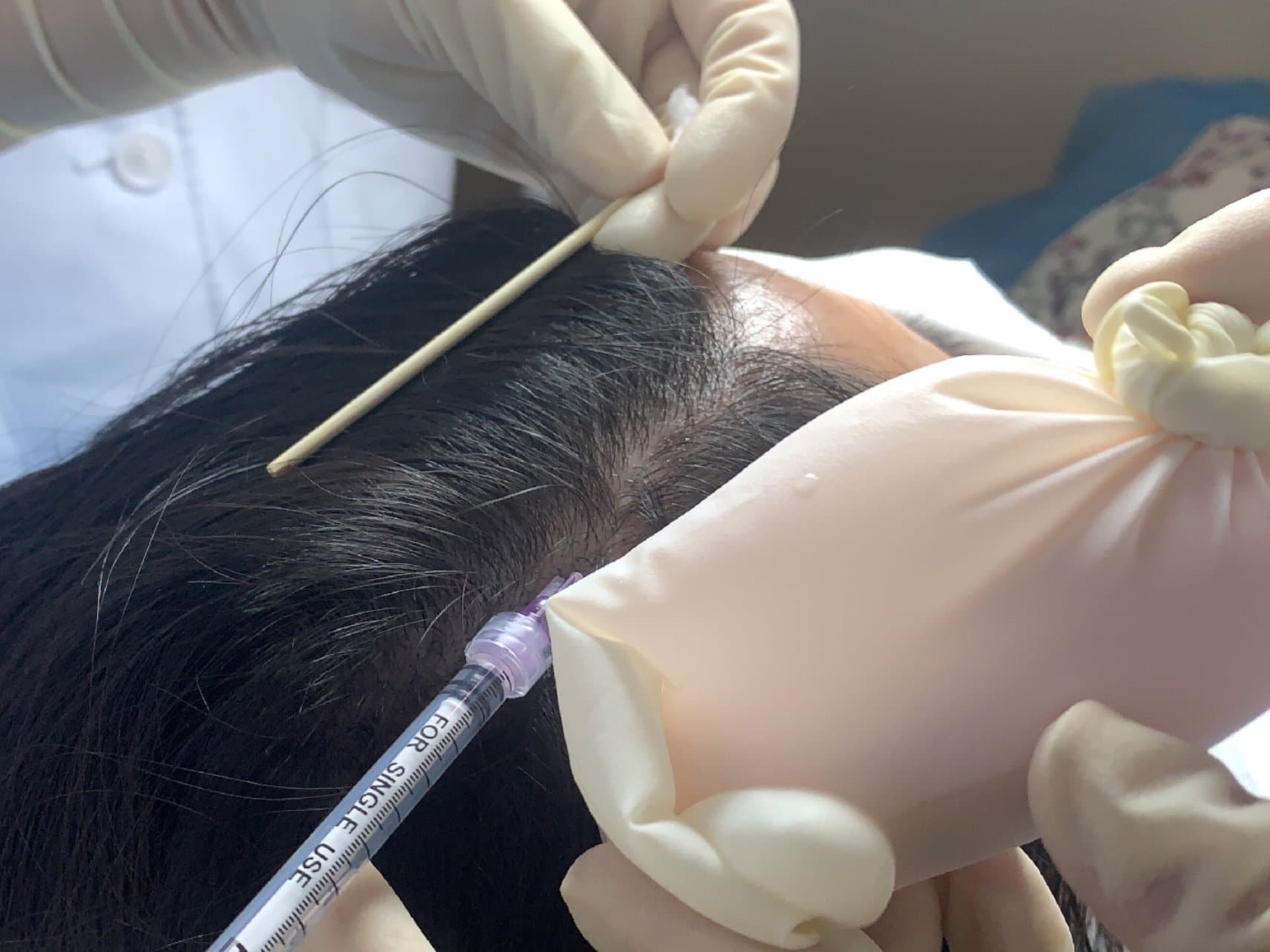 医生助理先认真的用酒精给头皮消毒,因为头皮不好上麻药,医生直接开始操作,超级喜欢这位叫王丽红的医生,专业,温柔而又霸道😄一边操作一边安慰我,像对待幼儿园的小朋友😄😄这次是手针加滚针,虽然比较酸爽,但是在王医生的安抚下,好像也不是那么疼了。