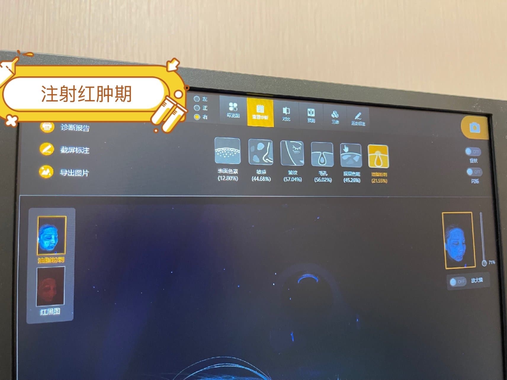 [:164]项目体验过程:没等多久先测试了皮肤状况,如图3,机器也是赶超其他同店。我本来是想再做个m22,医生看了我的皮肤状况没有盲目推销,建议我两周后再去做。敷麻药已经成了面膜表麻。真的效果太好了,还非常方便。之后消毒开始。用的是0.5的伊肤泉滚针。在面膜没有覆盖的地方还是稍微有些疼痛感。医生非常专业,在我的斑点部位有针对性的着重加强。结束后敷了一片械字号的面膜。反复和我确认了术后要点。