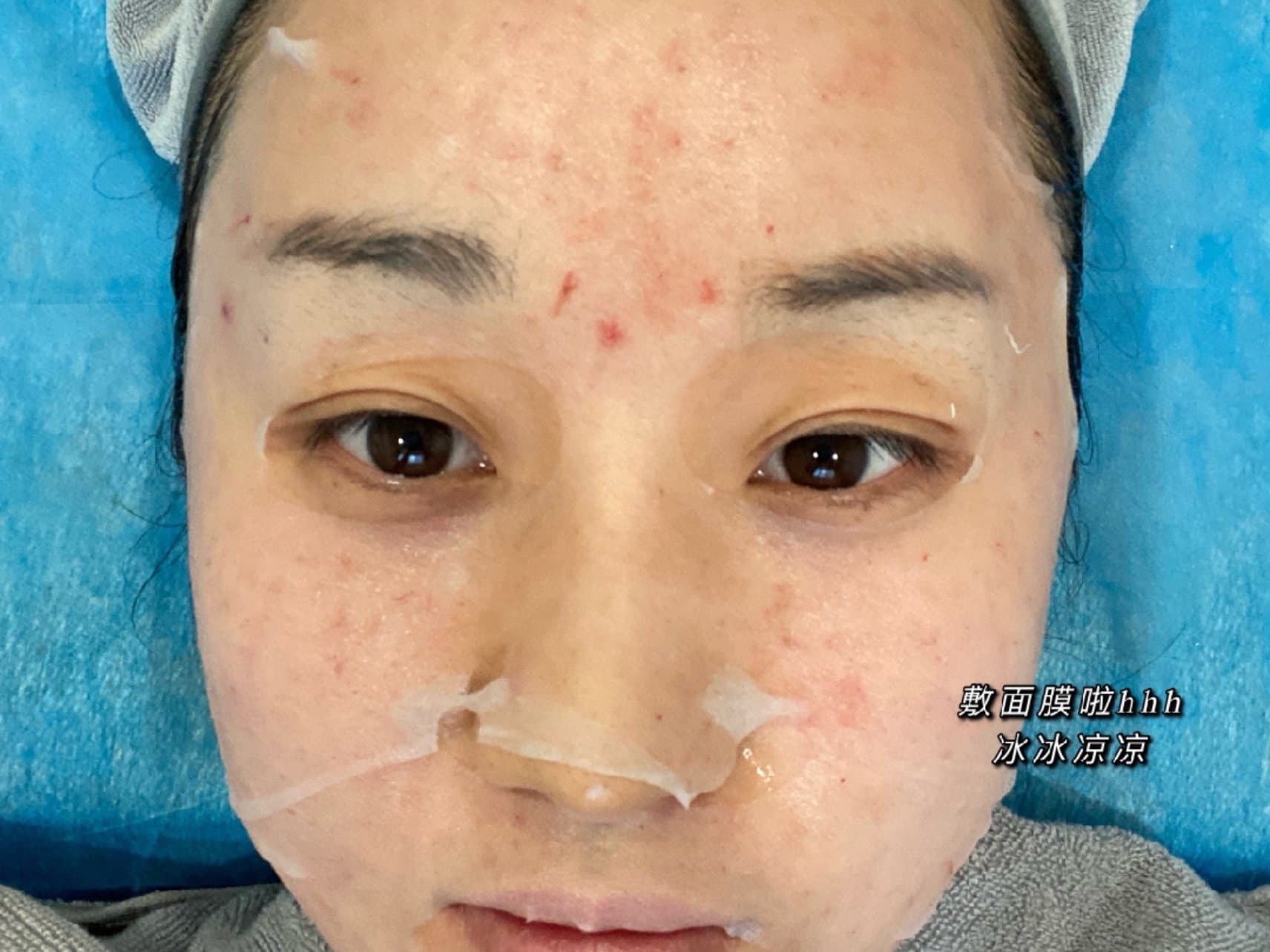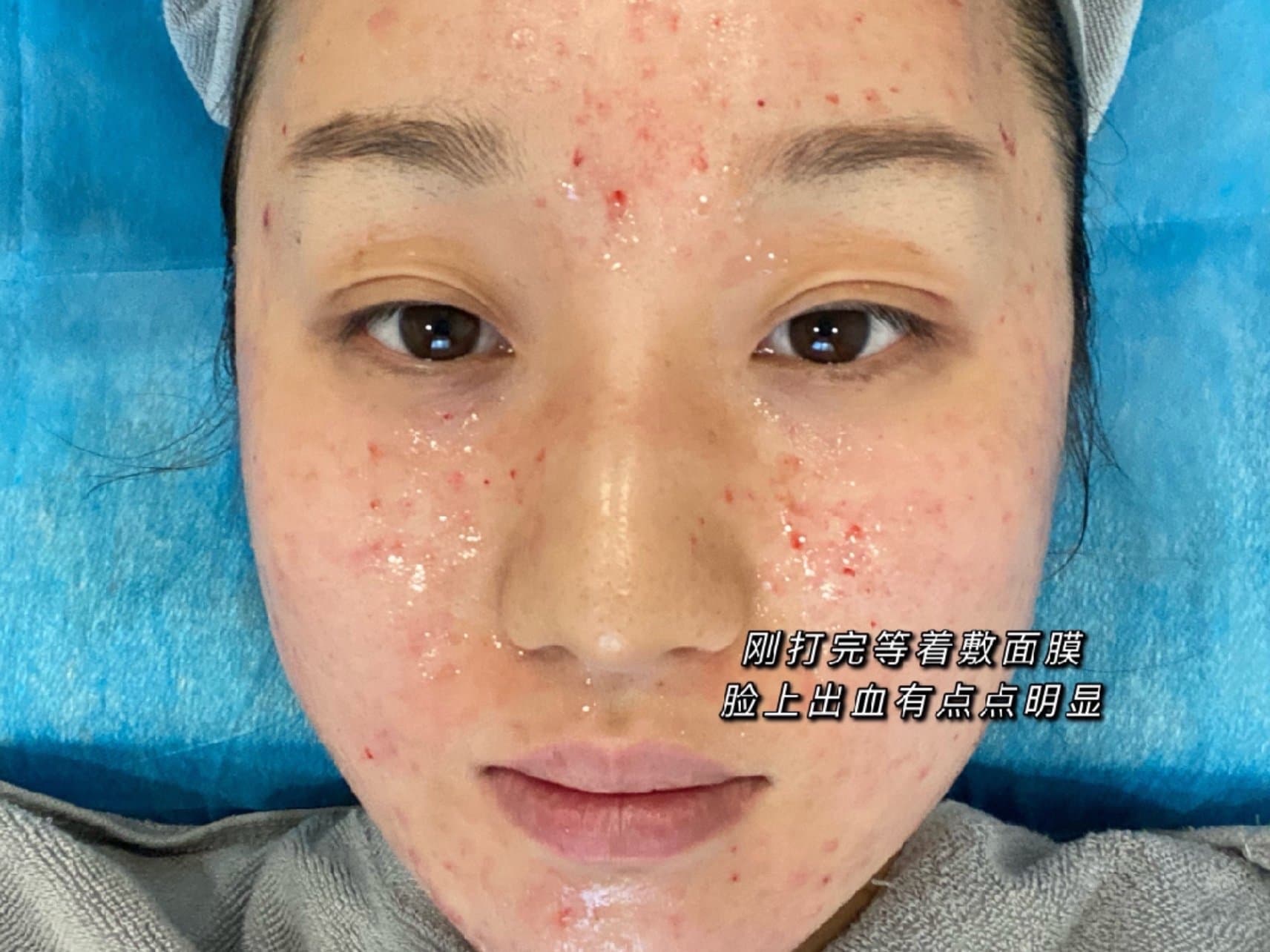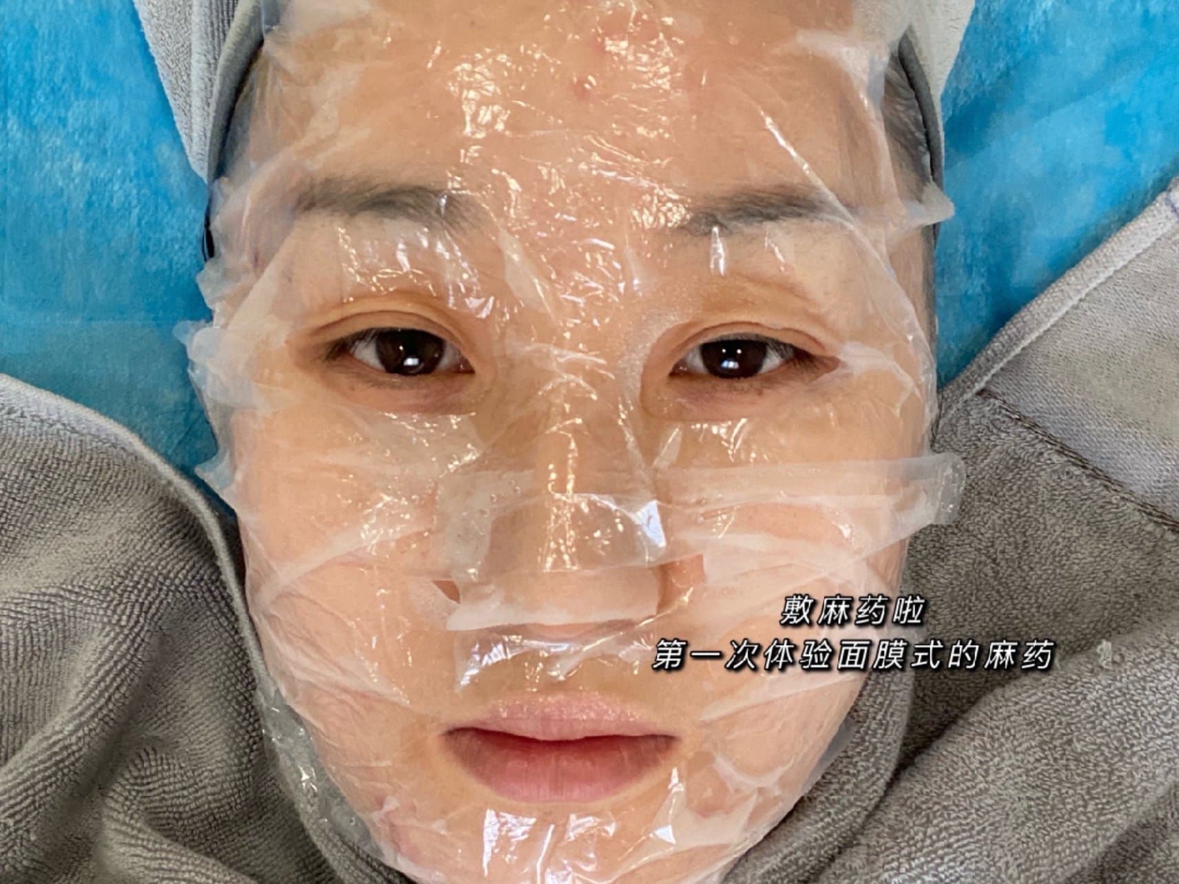 敷麻药:因为脸上痘痘还有点儿多,就先给我敷了点儿红霉素,然后敷了麻药,是面膜式麻药,也是第一次体验!大概敷了20min,我等待的时候去给我朋友进行了皮肤检测和敷麻药,我俩挨着做hhh