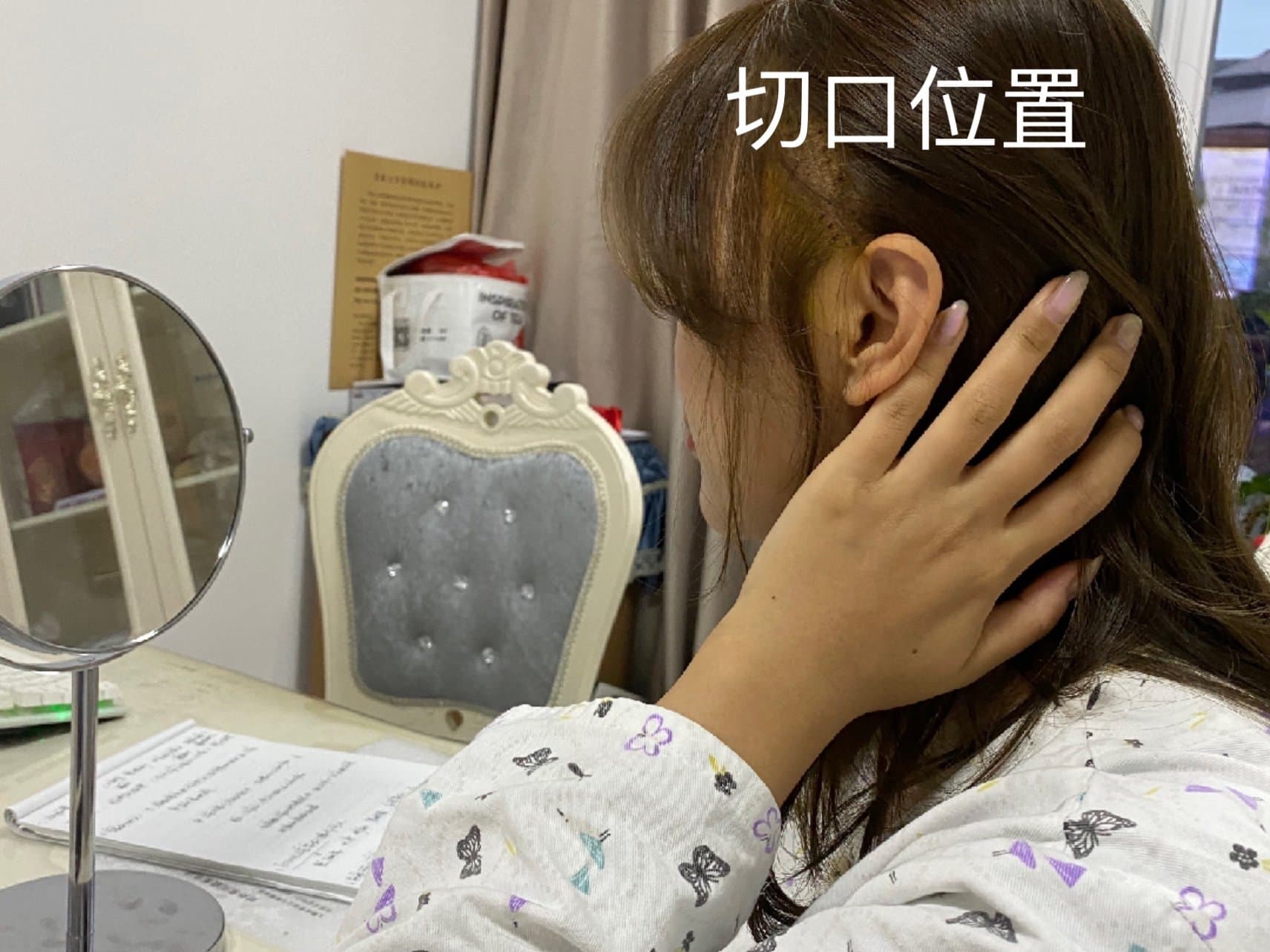 [:162]体验后效果:日记就不露脸给大家分享了,怕被朋友看到,主要拍切口的位置给大家看看在哪里,别看切口比较长,但说实话切的不多也没效果的,好在切口很隐蔽,好了头发是照样长出来的,不影响,推荐三四十岁脸跟我一样比较松垮的可以先做小拉皮