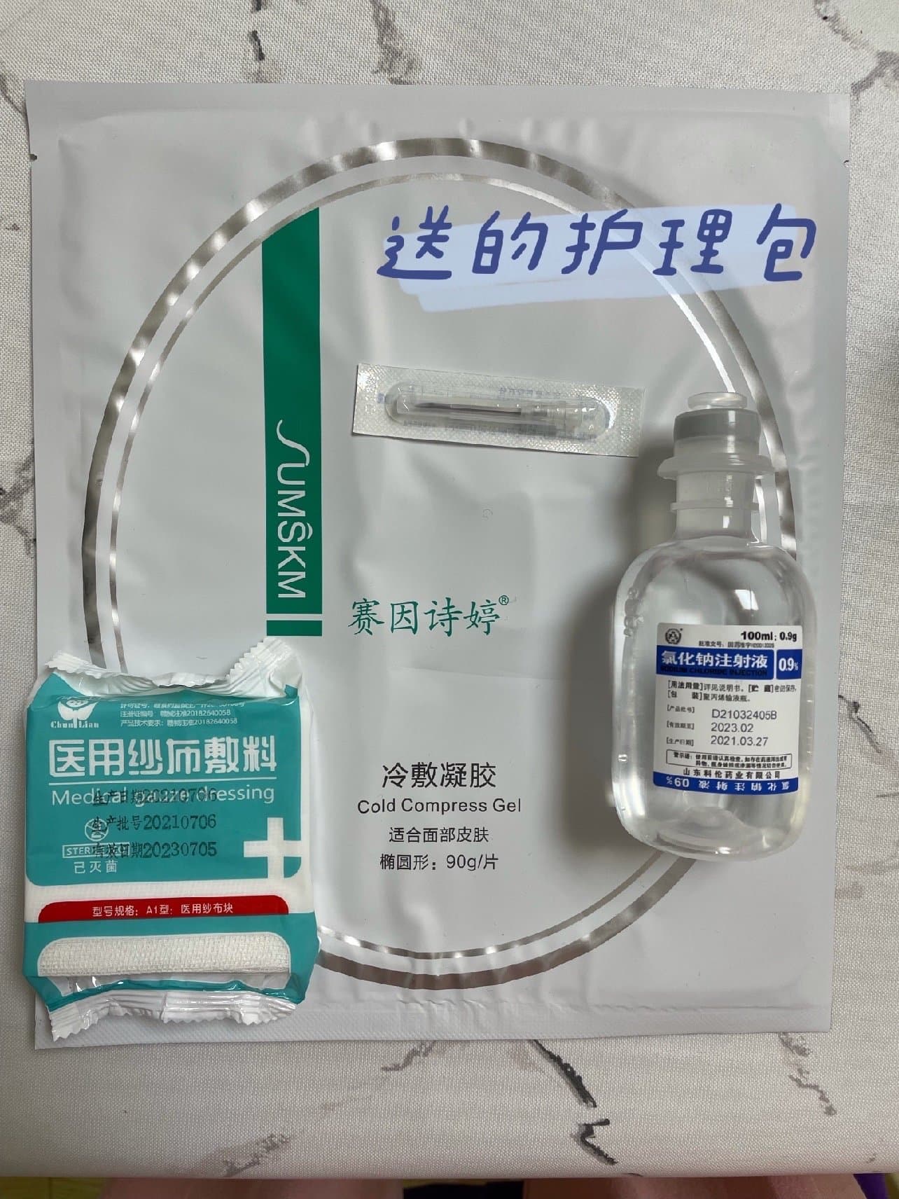 5⃣️重点来了!我头一次遇到会给护理包的!!!里面有一瓶生理盐水,一个针头,一包医用纱布,一张赛因诗婷的水晶面膜,超厚!