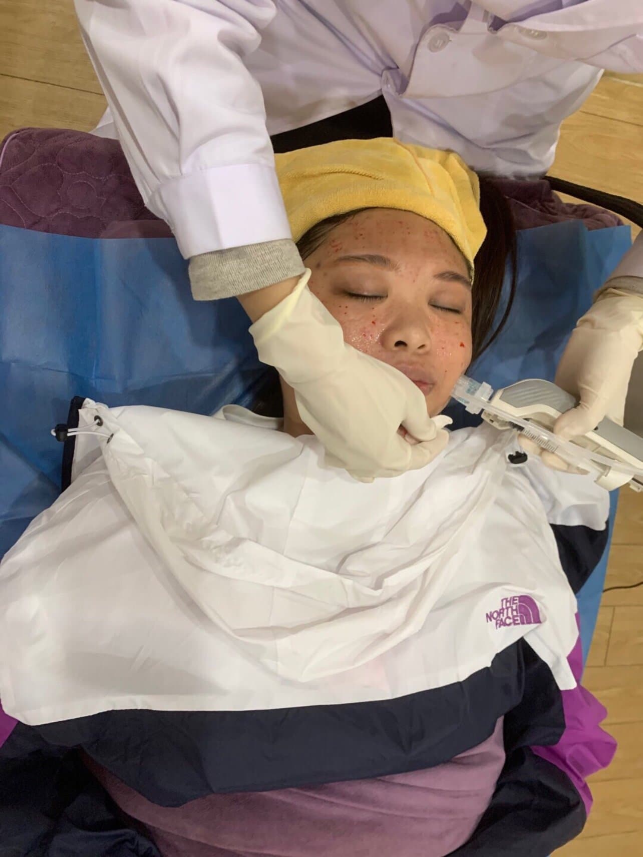 注射结束后脸部麻药还没过,有点麻,医院配有医用面膜,敷完后针扣基本不出血了,一点点红色的是针扣,都会有的,接来下的7天恢复期最好是每天1-2片医用面膜,尤其是前三天,疯狂补水效果更明显。