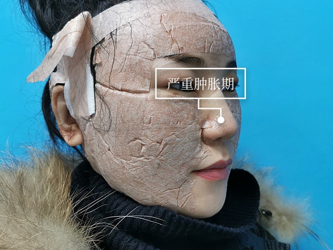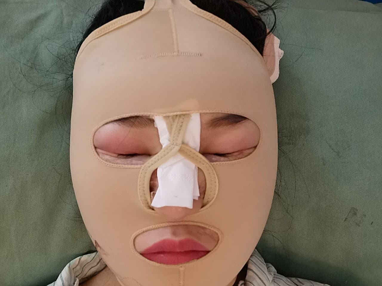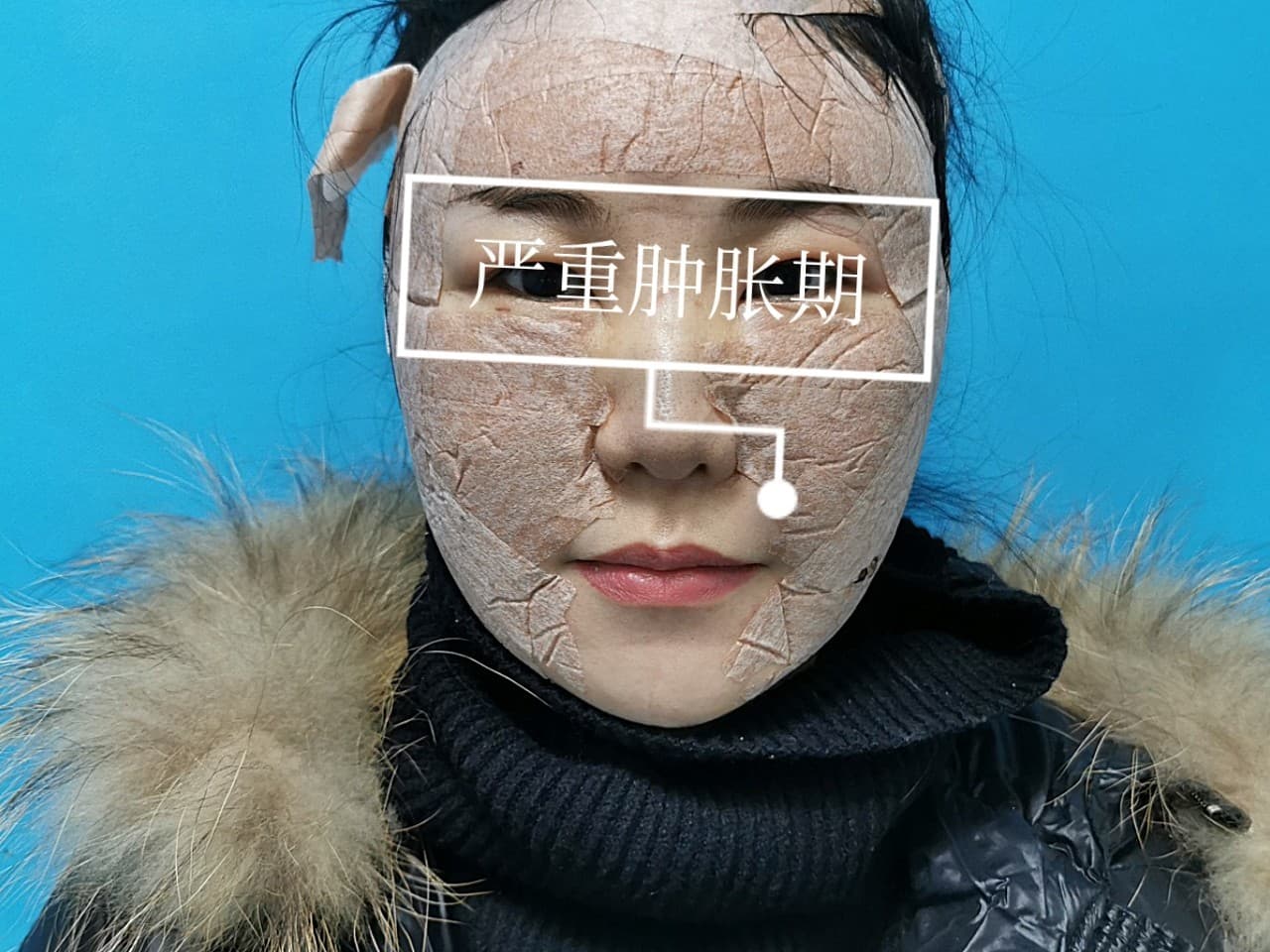 体验后效果:醒来后~镜子里的包子脸~肿到变形~头部切口隐隐作疼,脸被面罩勒得喘不过气😭