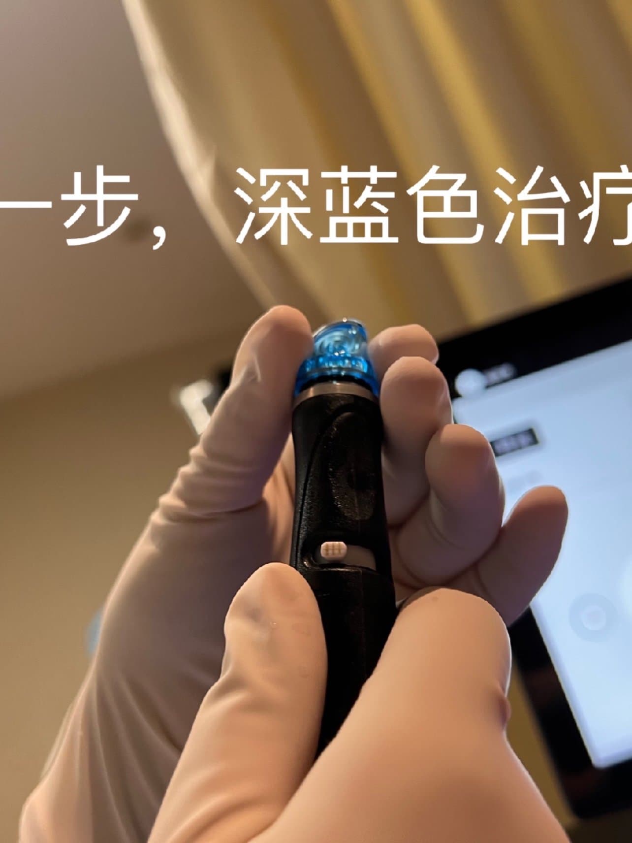 第一步,用深蓝色的治疗头打开毛孔,整个过程十分钟,面部很舒服,使我们的毛孔张开,有利于下一步的清洁。