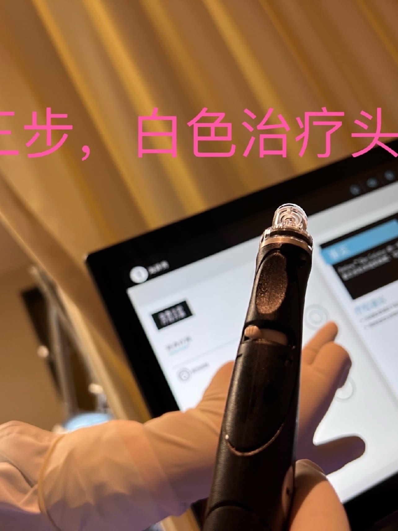 第三步,使用白色的治疗头,治疗头加入很多精华滋养精华,起到修复肌肤和滋养皮肤的功效,该过程十几分钟。