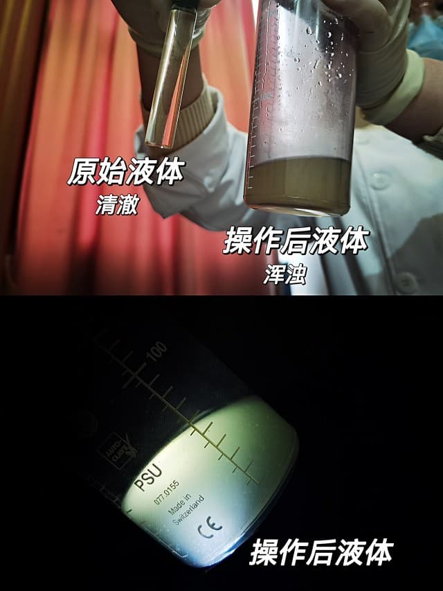 操作后小姐姐给我看了治疗罐内液体,与未治疗液体对比,明显变得浑浊。