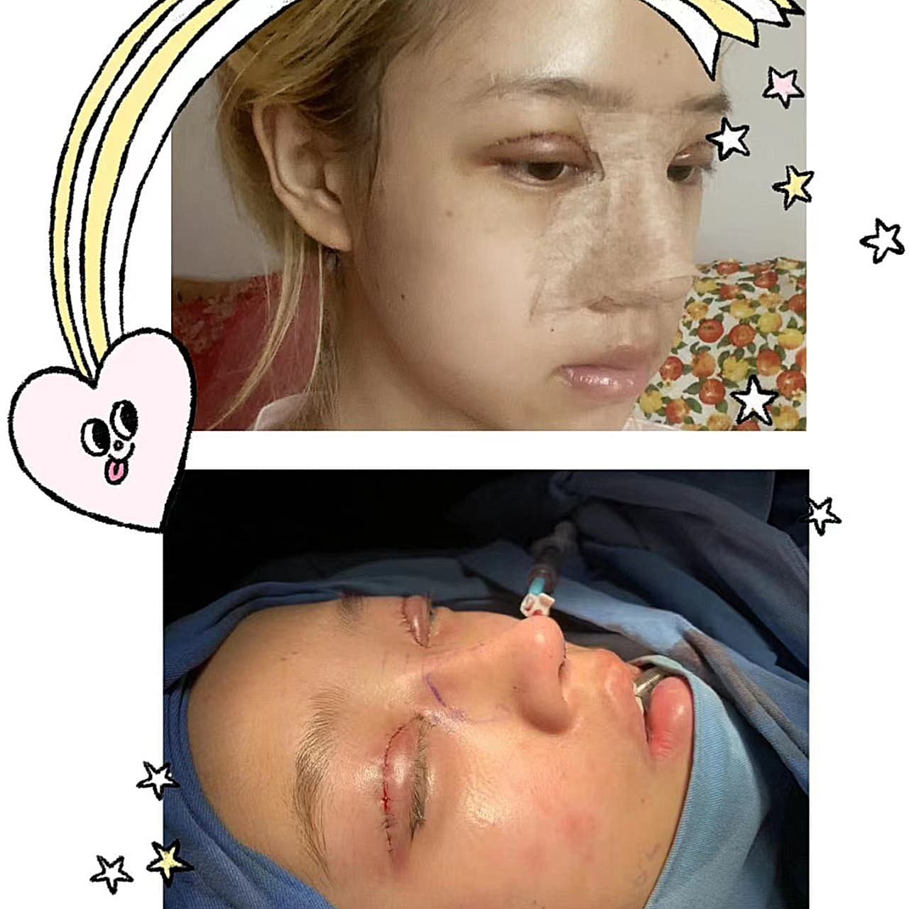 和段焘医生面诊了两次,手术前还沟通了一次,把自己的诉求说的和很明白,段医生的想法和设计也非常符合我的想法,所以眼睛和鼻子都是让段医生做的,手术全麻的,迷迷糊糊就晕过去了,醒来已经做完手术了,看着自己眼睛直接肿成金鱼眼,鼻子也被包住了,有点没缓过来神,只有脑袋痛提醒着我真的做完手术了,晚上的时候痛感越来越明显,护士小姐姐会帮忙冰敷,实在熬不住就睡过去了,第二天痛感减轻了很多,在医院住了三天回家了,回家的时候除了肿其他感觉都还挺不错了。