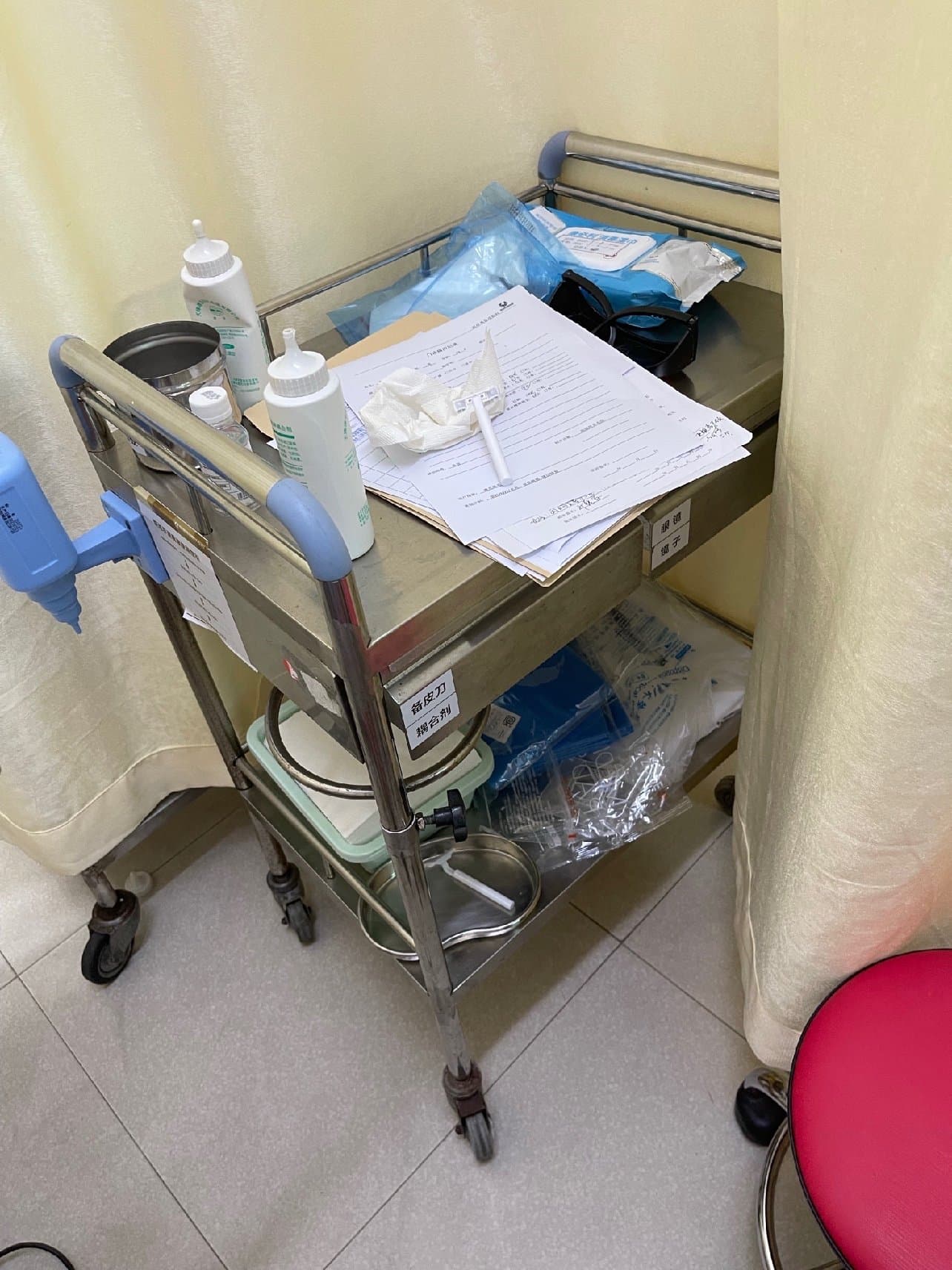 激光脱毛在五楼,使用飞顿的冰点系列仪器。护士会先看需不需要备皮,帮我需要做的地方的毛发刮得很干净。然后涂上冷凝胶,就可以开始操作了。仪器发出红光给毛发吸收,会比较疼,所以护士会调节能量。大概十分钟就操作到位完成了。