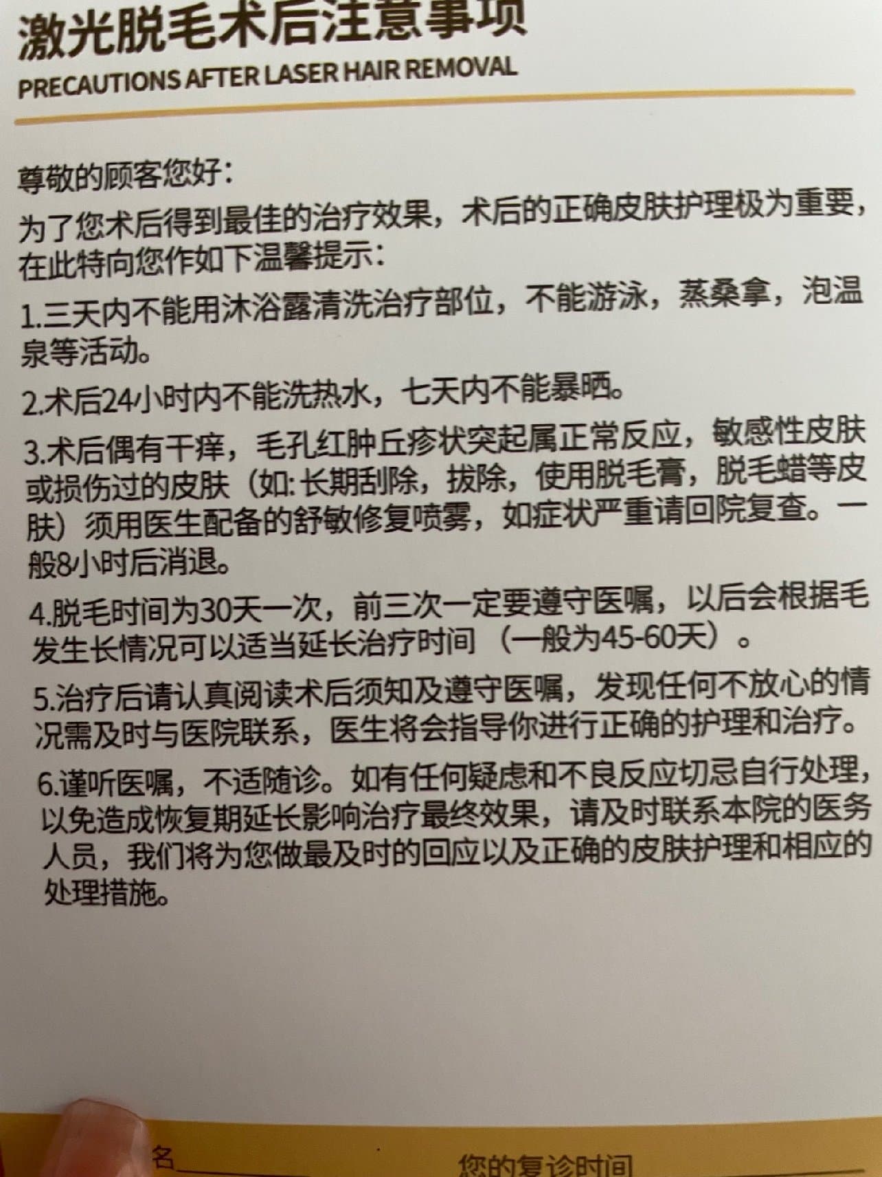 体验还不错子,没有说推销一些项目什么的,本社恐觉得不错子,嘿嘿,可能她们看出我比较社恐,也就没有打扰到我。可能是因为是新店,室内的环境也很好,装潢也很高级,操作的小姐姐也很细心,不会刮破皮,整个流程也很快,不会很痛。并且他们的刮毛刀是会重新开的,我去之前老害怕是重复使用的,还自己带了消毒棉片和刮毛刀😂😂。并且走的时候很贴心的给了注意事项的小卡片。