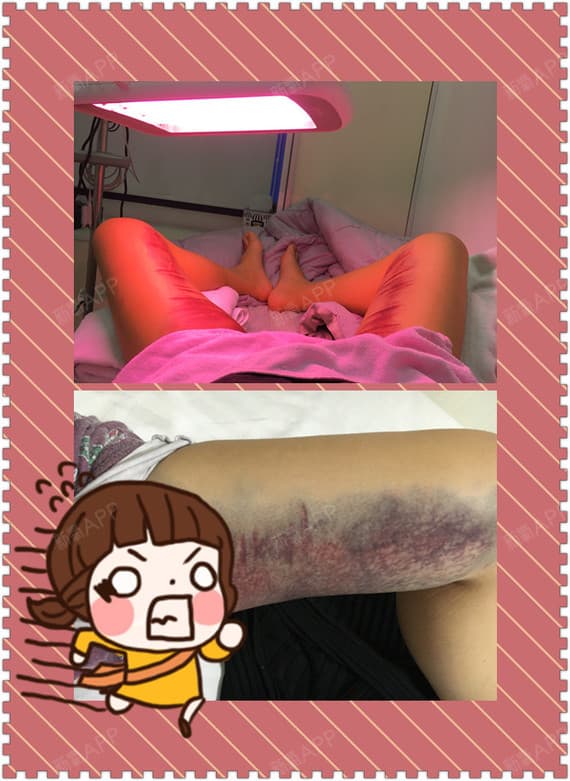 楼主心也好累的,第一张小图是撕掉衫布治疗的时候,第二张上晚上的时候。感觉整个腿是被人抽过一样,漂亮的治疗姐姐说我的淤青比较严重,同伴做完吸脂都没有我那么淤紫。所以小伙伴们不要认为是院长的问题。这个真的跟体质有关系哦!小时候我身上也是轻轻一碰就发紫,写出来只是想告诉小氧气们要淡定。