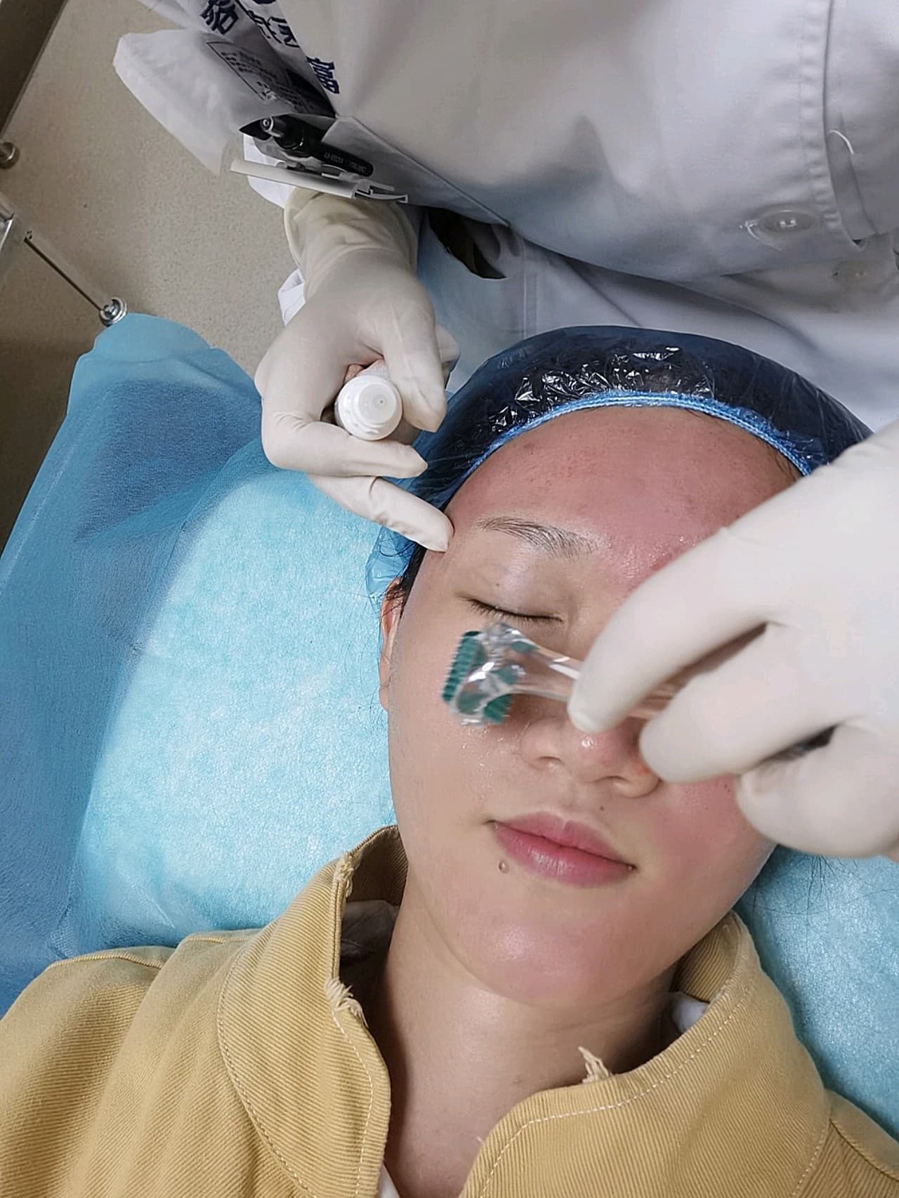 今天来做了胶原微针,中午的时候人没那么多,不像其他评论里说的要排队等很久😂很快就安排上了敷麻,大概四十分钟左右吧,卸掉麻药,脸部消毒,然后就可以开始滚针了,医生会当面把新的药水和针头拆开给你看。