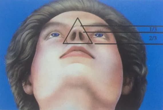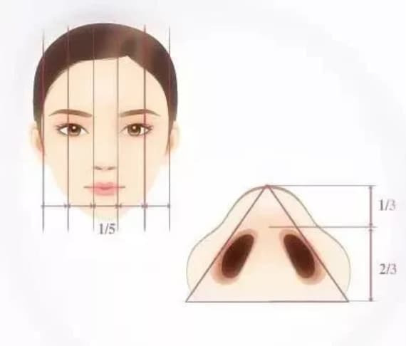 鼻头的审美是这样的,当仰面时,鼻小叶部分和鼻小柱应为1:2的比例,小柱和鼻底的轮廓应是一个等边三角形;