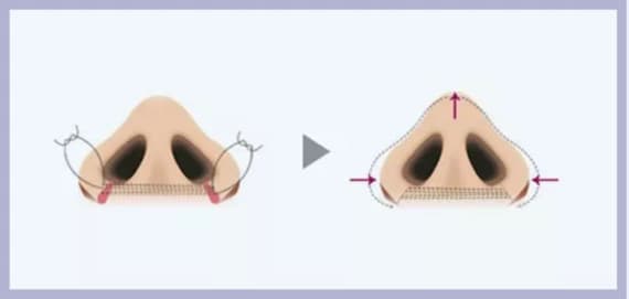 切口位于鼻翼基底及鼻翼沟下部,局麻下适当切除部分鼻翼基底全层组织,然后内旋推进,缩小鼻孔,分层间断缝合。