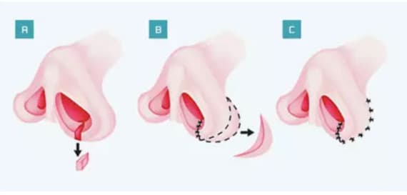 如果是鼻翼缘比较宽大,需要做鼻翼缩小手术的话,那么可以选择在鼻翼和面颊的交界处做切口,切除5-8mm鼻翼皮肤,可使鼻翼缩窄,鼻孔由扁平变长,鼻尖亦可有所抬高。