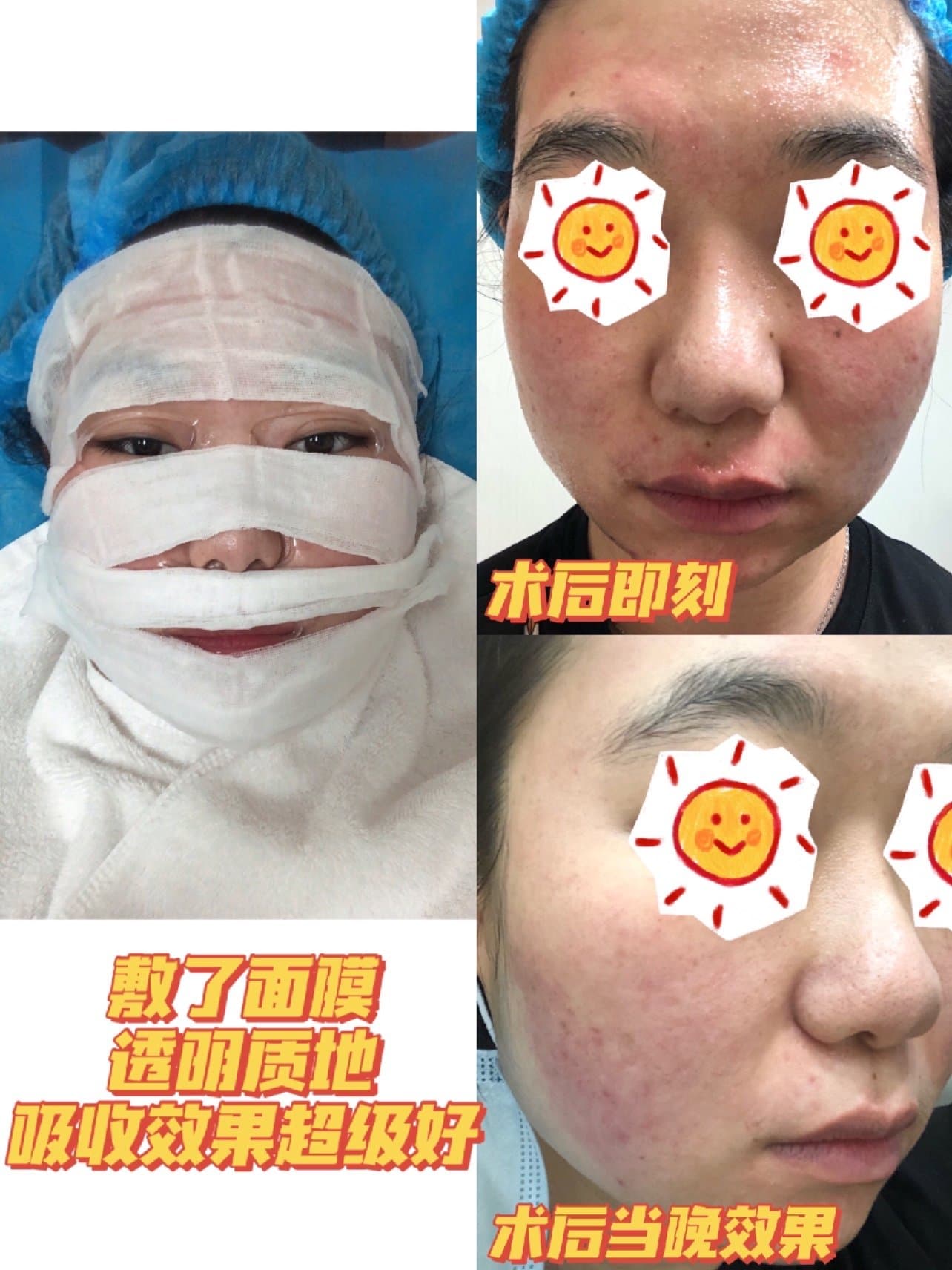 ❤️上脸的感受:刚做完脸部并没有很火辣辣的感觉,可能医生的技术很到位,大概敷完面膜以后红色也褪去一些,没有术后即刻那么红了,到了晚上面部仍然很舒服没有其他异样,第二天早上醒来皮肤有一些红,但是没有干涩的感觉,感觉痘痘那边有一点点的变淡,3天后明显感觉肌肤状态好了很多,不发红了,也细腻了不少,重点是痘痘和痘印确实淡了很多,超级棒
