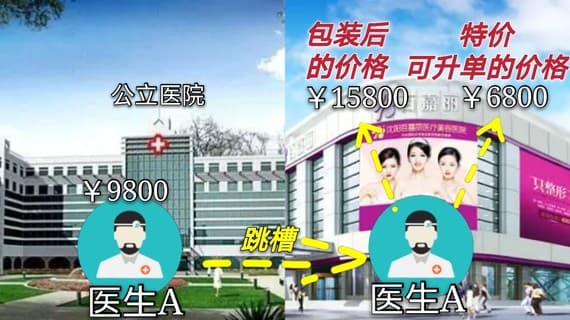 举个例子,某公立整外医生,资历12年,在本院的双眼皮价格是9800,跳槽去私立整形机构的价格可能是15800,也有可能是6800。