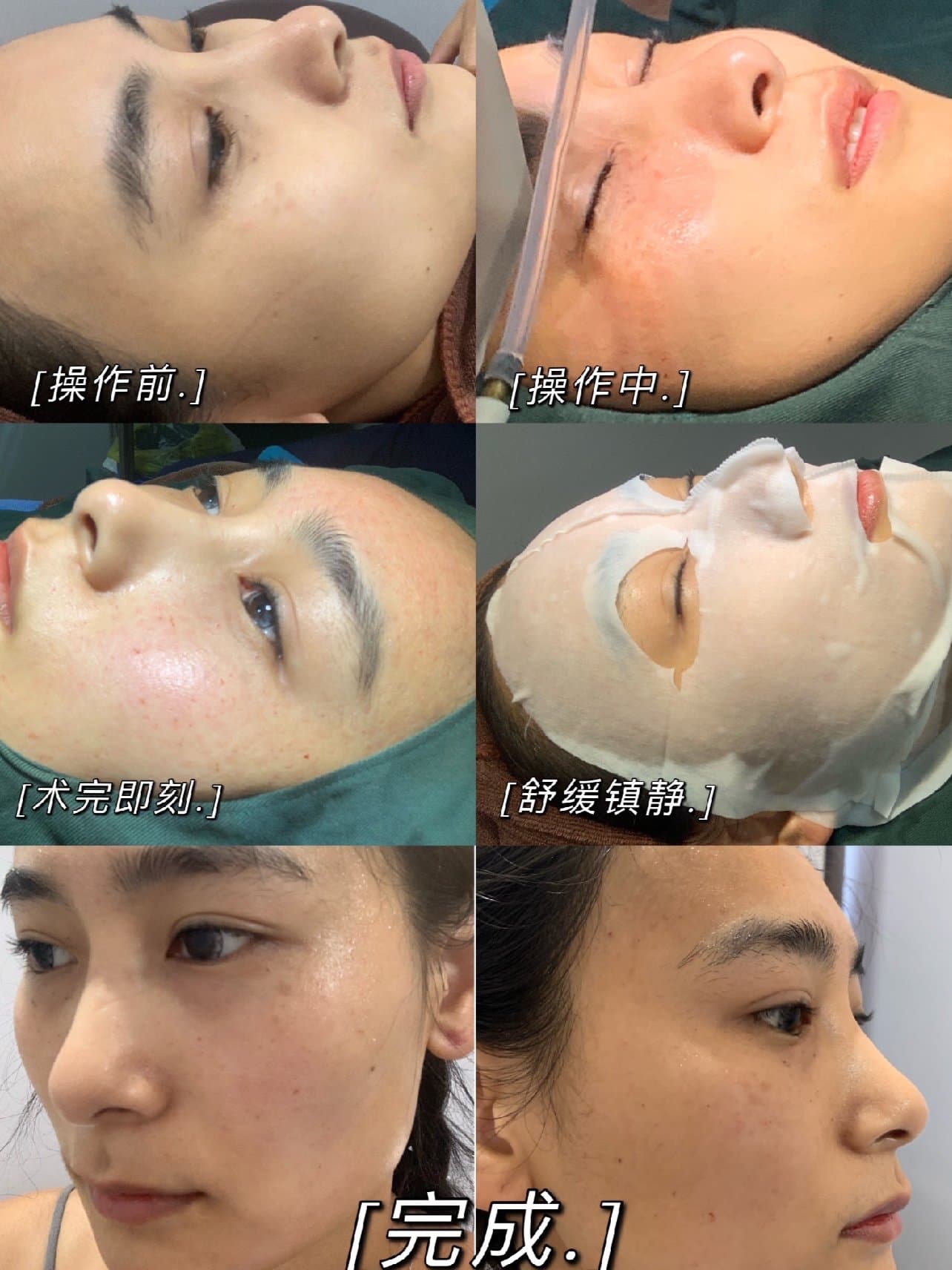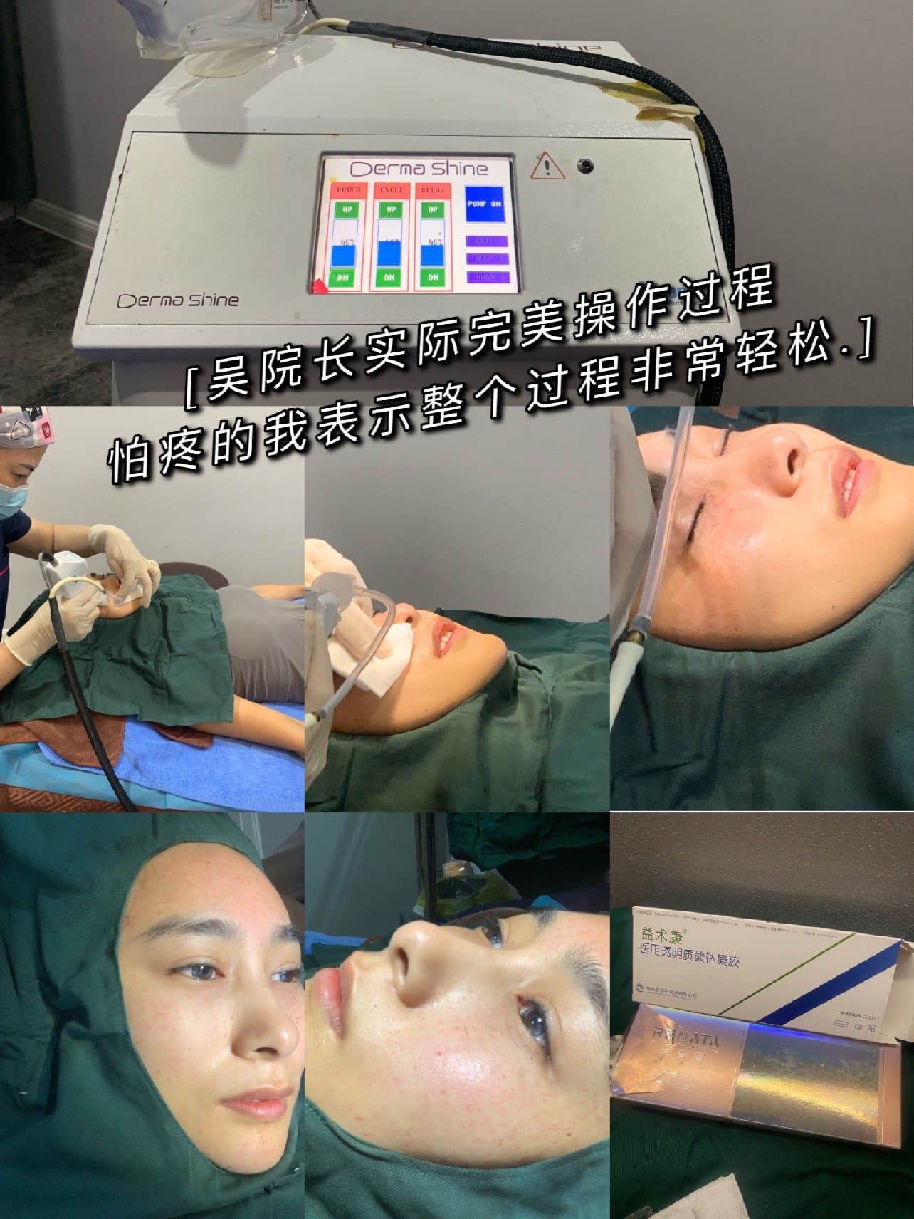🌈开始操作了,我是真的很怕,双手抓着,护士小姐姐看到了和院长两个人一起开导了一下,第一针下去,诶,还行不疼,之后我就越来越放松,因为即使是边边角角也完全是可忍受的疼痛,吴院长在打一些部位的时候会反复和我确认是否疼痛,真的好贴心,然后一些着重的部位,比如额头还有有斑的地方会给我重复操作,期间换了🌈3次针头,刚知道就是为了更好的效果防止针头顿挫,也为了避免漏液。学到了学到了!