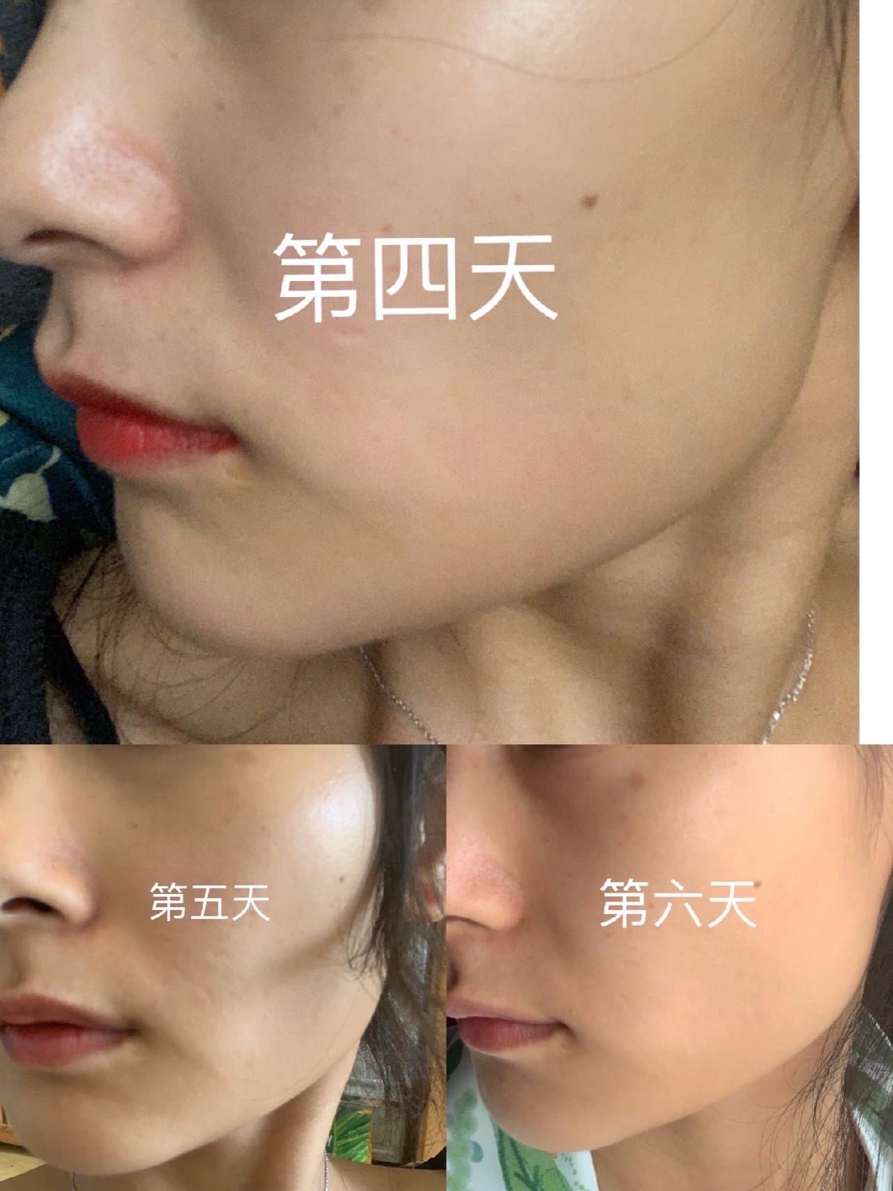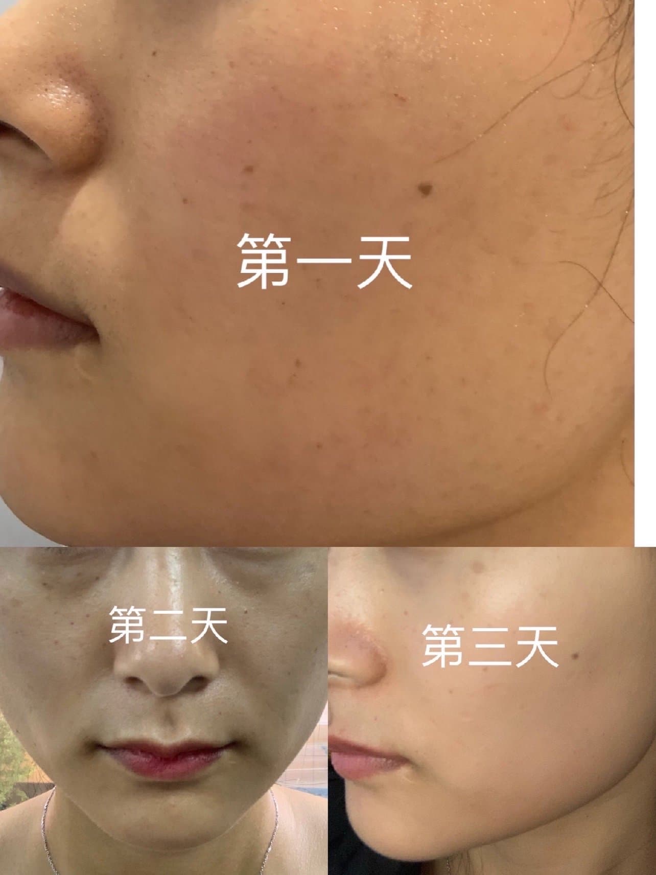 🌈没有很注意防晒,骑了摩托吹到了风晒到了点太阳🌞所以期间反黑了一点,油黑油黑的那种感觉,还好稳住了心态。大家一定要注意防护啊,毕竟头三天不能涂防晒。