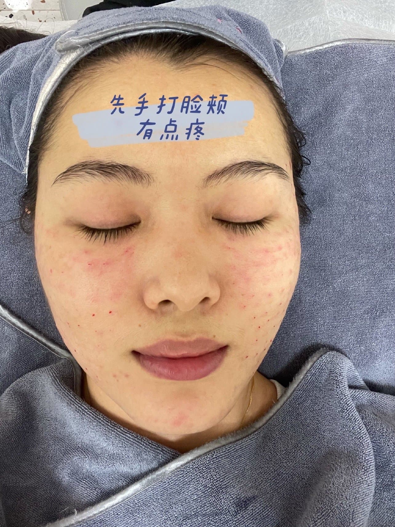 3⃣️手打完脸颊之后用0.5的滚针滚,相比手打,这个真的不痛。因为我长痘痘,所以小美女使劲的在痘痘那滚了滚,我毛孔大,所以也使劲滚了滚。边打边涂聚光素。