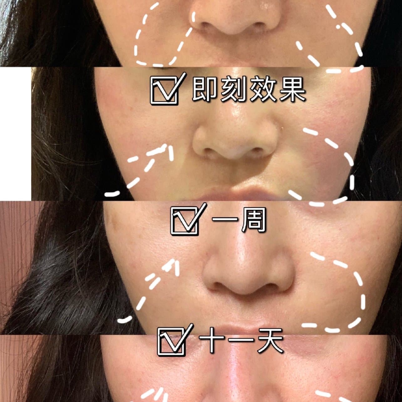 第1️⃣1️⃣天:面部肌肤紧致,皮肤🈶️弹力,双下巴也有线条了,嘴角上扬,法令纹淡化,脸呈V字更明显。面部看着小了,是因为皮肤收紧,从而改善了皮肤衰老导致的以上问题。