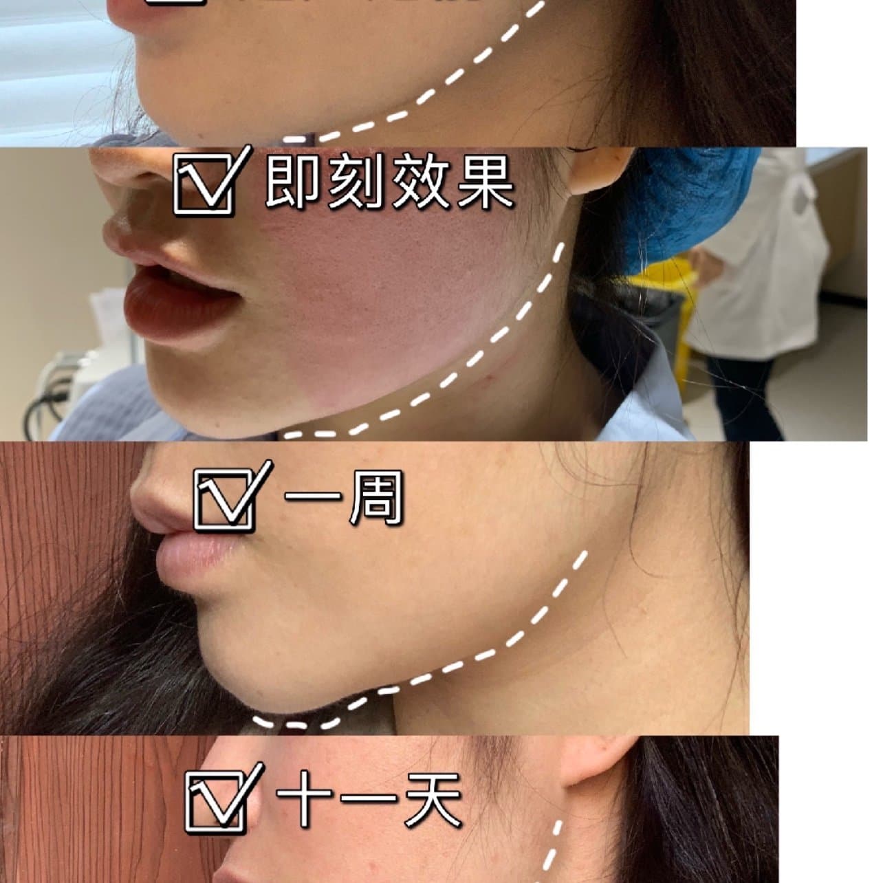第3️⃣天:丘疹消退面积小了,脸也消肿了一点,没那么方了✌️,仰脖子时下颌缘两侧🈶️拉扯痛感,我能理解是因为紧致了么,之前松弛所以向前向后都随意。