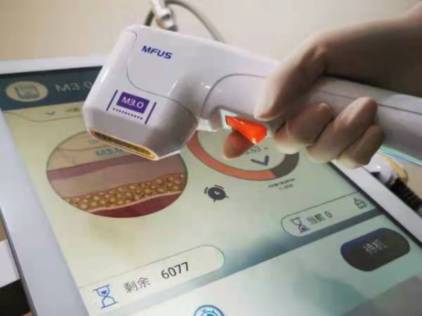 不算洗脸等准备工作,整个实际操作大概40分钟,脸上涂上润滑剂,半边脸半边脸的操作,先操作M4.5的刀头,总共6654发,主要作用于深层,起到提拉紧致的作用,再操作D4.5的炮头,总共5分钟,主要作用于深层,起到提拉紧致的作用;最后操作3.0的刀头总共6077发,主要作用于浅层,有一定的溶脂效果。