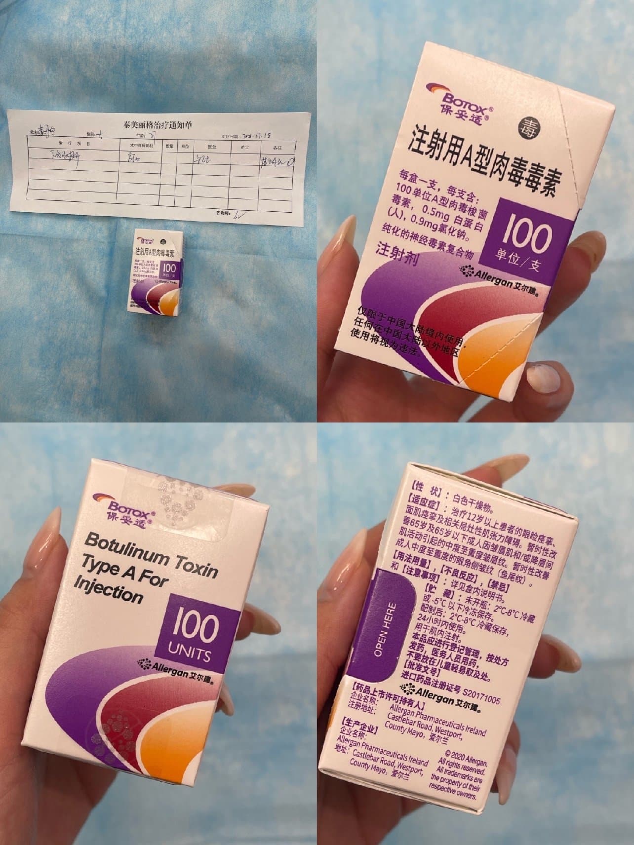 3)注射前会给你看保妥适的药,有正规防伪码,可当场验药。注射的时候在脸部两侧打了有个6-7个,因为我有一些双下巴,最后的剂量扎在了我的下巴和颈阔肌上。过程很快,5分钟不到,医生手法很娴熟。打完平躺1分钟就可以起来了。整体不疼,针眼小到完全看不见。