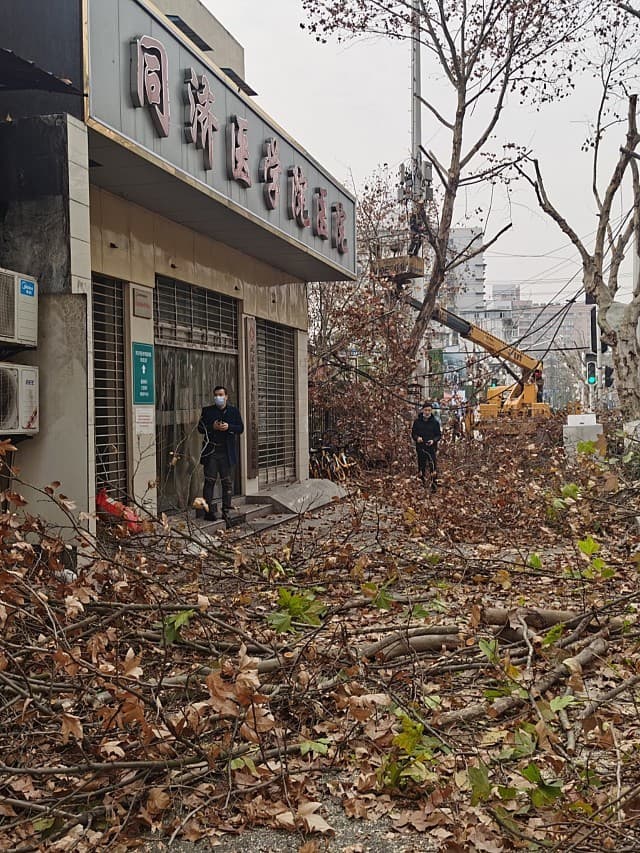 1月15日下午去的医院,正好赶上医院门口在施工砍树,路面情况不好,停车也不是很方便。我真的需要越过木枝的丛林才能进到医院里!