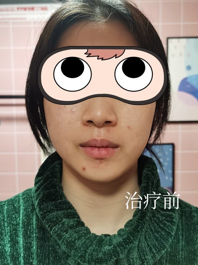 我的面部肤色不均、痘印明显、嘴角暗沉,面颊两侧有大面积的红血丝,皮肤敏感,容易泛红,眼周下有2条干纹和眼袋。