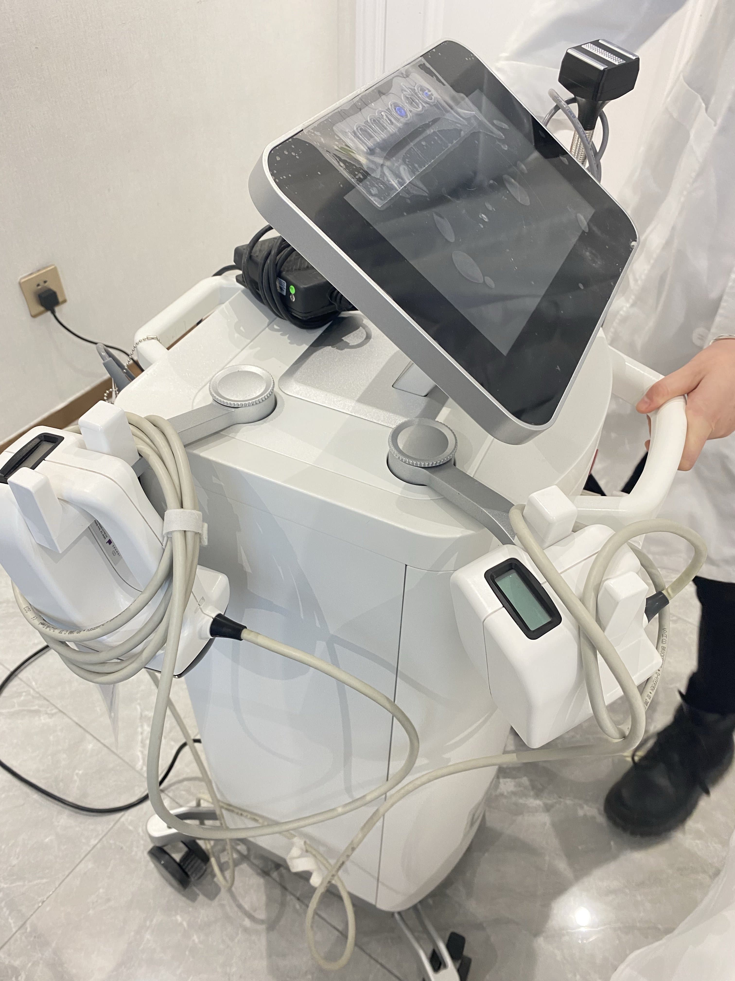 项目中:上楼先拍照,正面,45,90 。然后小姐姐就带我到治疗室。第一次中奖及第一次做这个项目整个过程我非常紧张,还好医生一直跟我聊天安抚我,没有麻药,如果姐妹家里有家用美容仪大概就跟那个三挡位差不多。不会很疼,有热感,但是效果是叠加的,所以后面会有感觉越来越热,可以跟医生说相对调整,但所有脸一定要同频率。治疗过程中我还手机放的音乐🎵(因为太紧张了手心都是汗哈哈哈)整个过程很细致,医生很贴心,因为双下巴比较明显还特意帮我重点处理。医生说做完即时的效果是百分之20,三天后根据代谢情况会越来越好。所以我们一起期待后续吧😚