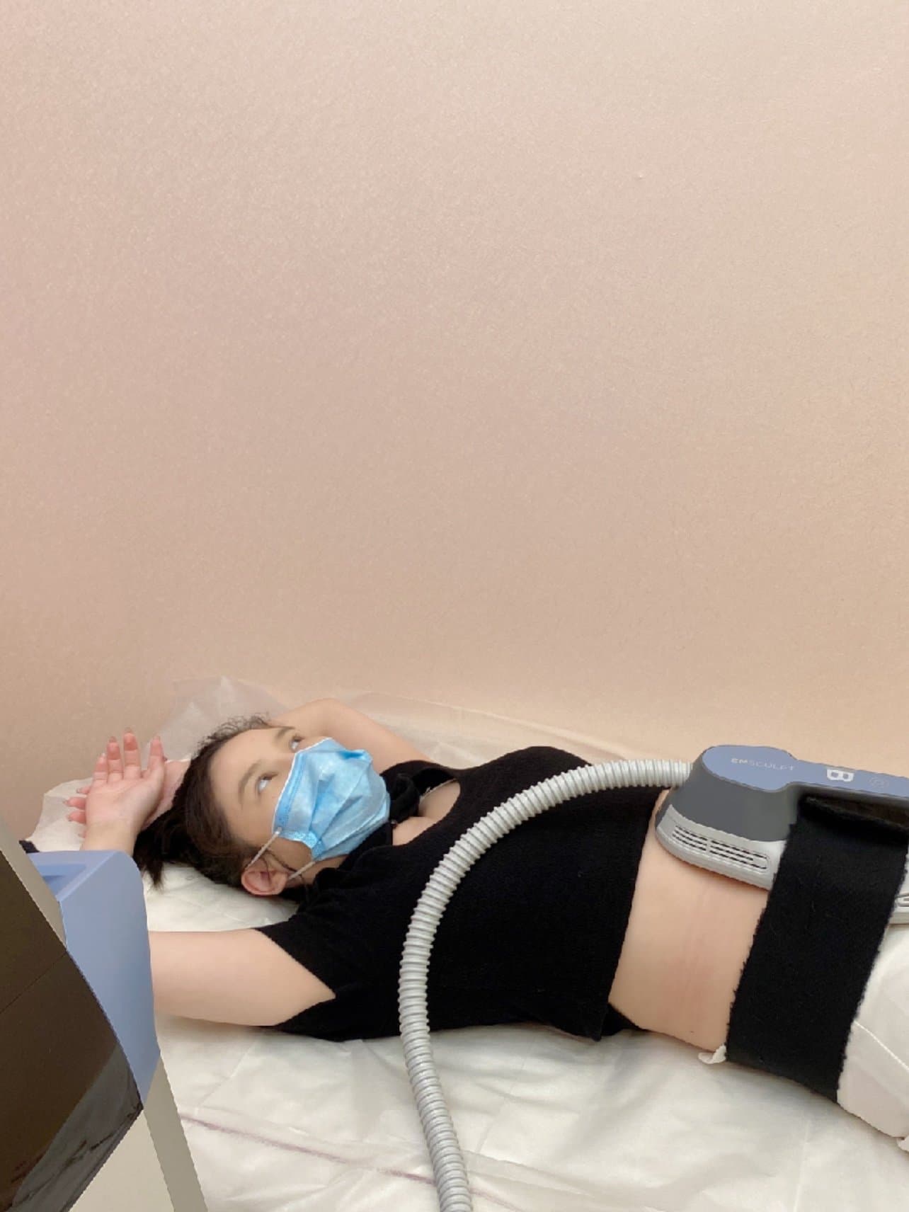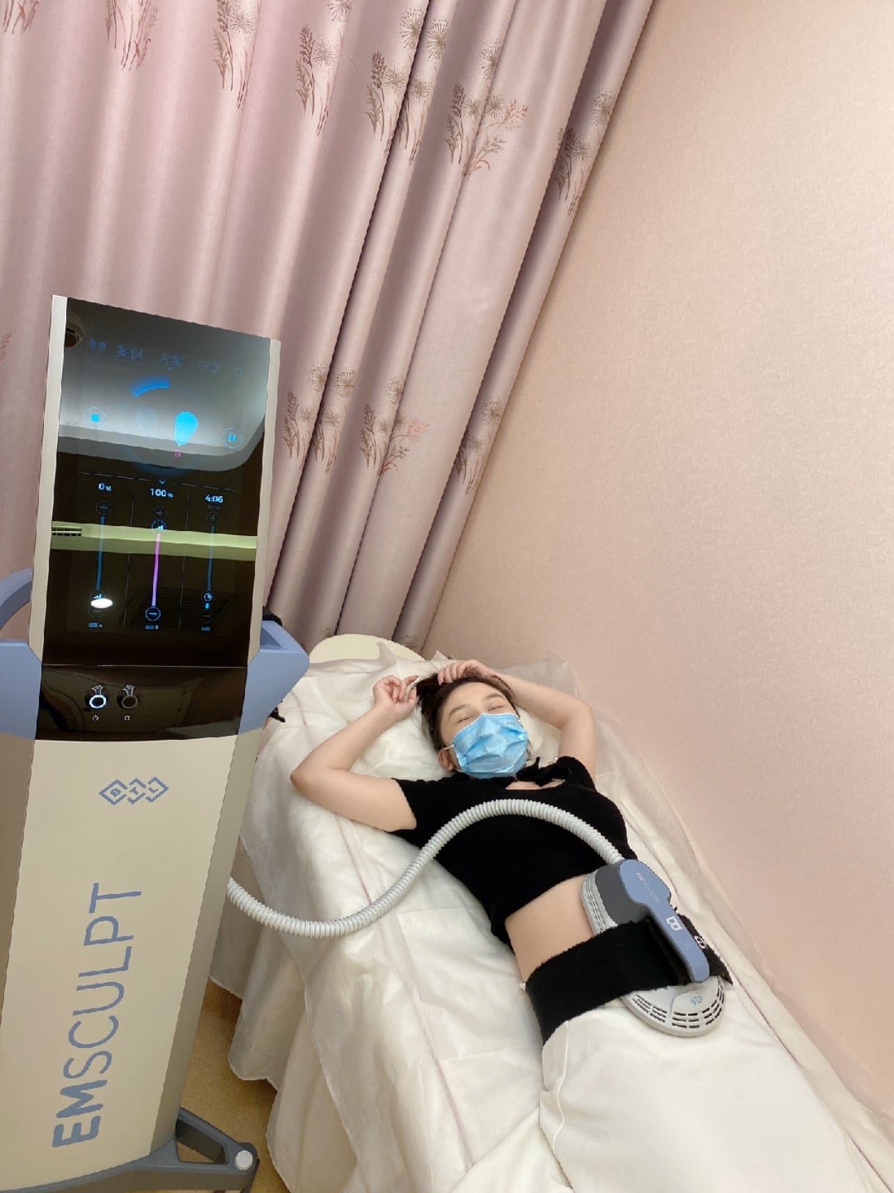 仪器的强度是可以调节,根据想要的效果和个人承受能力去调节,医生小姐姐一开始帮我调节的比较弱,没有疼痛感,只有牵扯感,机器作用的时候,感觉腹部的肌肉被拉扯,一直顺眼到小腿肌肉,仪器会发出嗡嗡的声音,作用一会儿,歇一会儿,然后大约五六分钟,就会变成敲打模式,说是排解乳酸,这样第二天就不会酸疼,敲打模式真的很舒服,后面小姐姐偷偷帮我吧能量调大了,我都没有察觉,虽然是体验,小姐姐还是希望我能体会到效果,所以偷偷开大了,我都没发现,后来他跟我说我才知道的,全程50分钟的样子,躺在床上,什么都不用动,就可以完成塑形体验,简直太方便了,还可以玩手机,和朋友聊天,我愿称之为塑形天花板