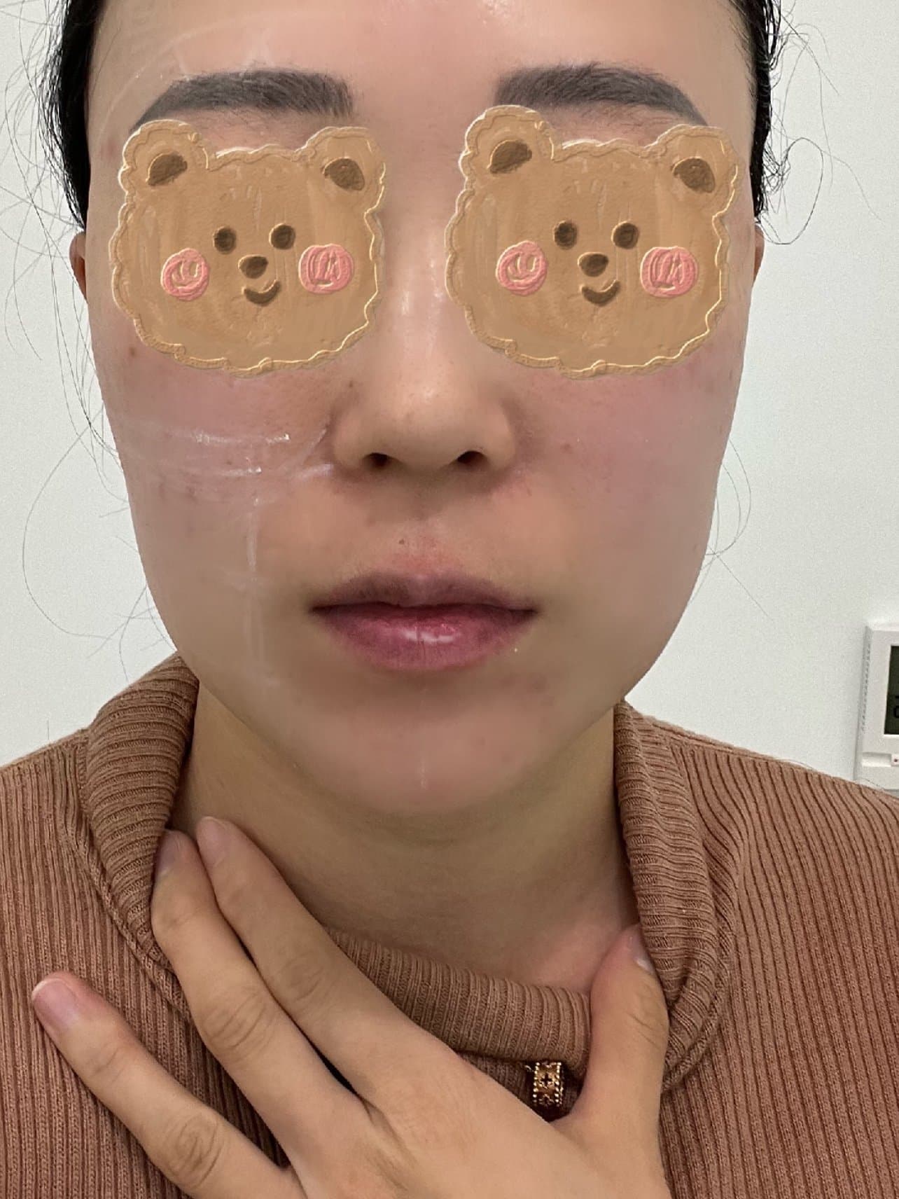 机器和治疗头进行扫码验真后 医生会在脸部设计治疗方案 用白色的笔画好 开始一侧脸治疗 痛感还是有的 但是可以忍受 图为单侧治疗后照片 似乎没看到特别明显效果