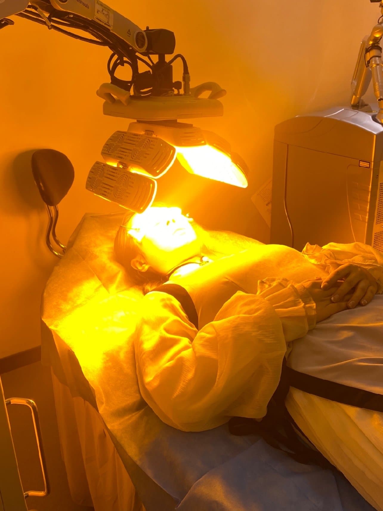带上眼镜,给脸敷一个医用面膜镇静肌肤Q,照射黄极光,大概20分钟。操作往往很简单,但是很有效果。
