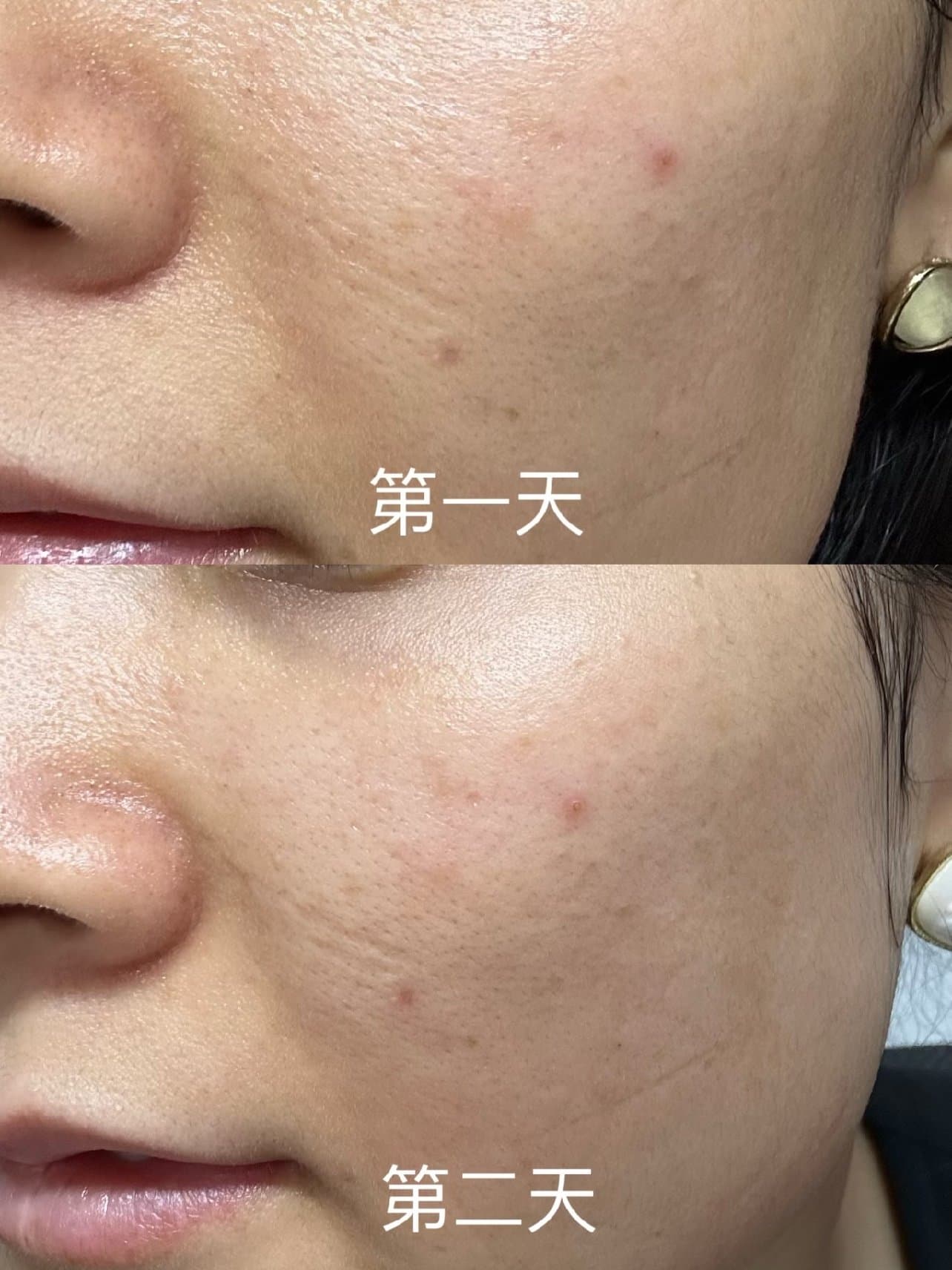 很多姐妹问我效果,我其实很难说上来,所以特意这次拍了照片记录,我最直观的感觉是皮肤更水润了,第二个就是更亮而且痘痘也出来了,而且法令纹也更浅了。看图说话,苹果原相机哟