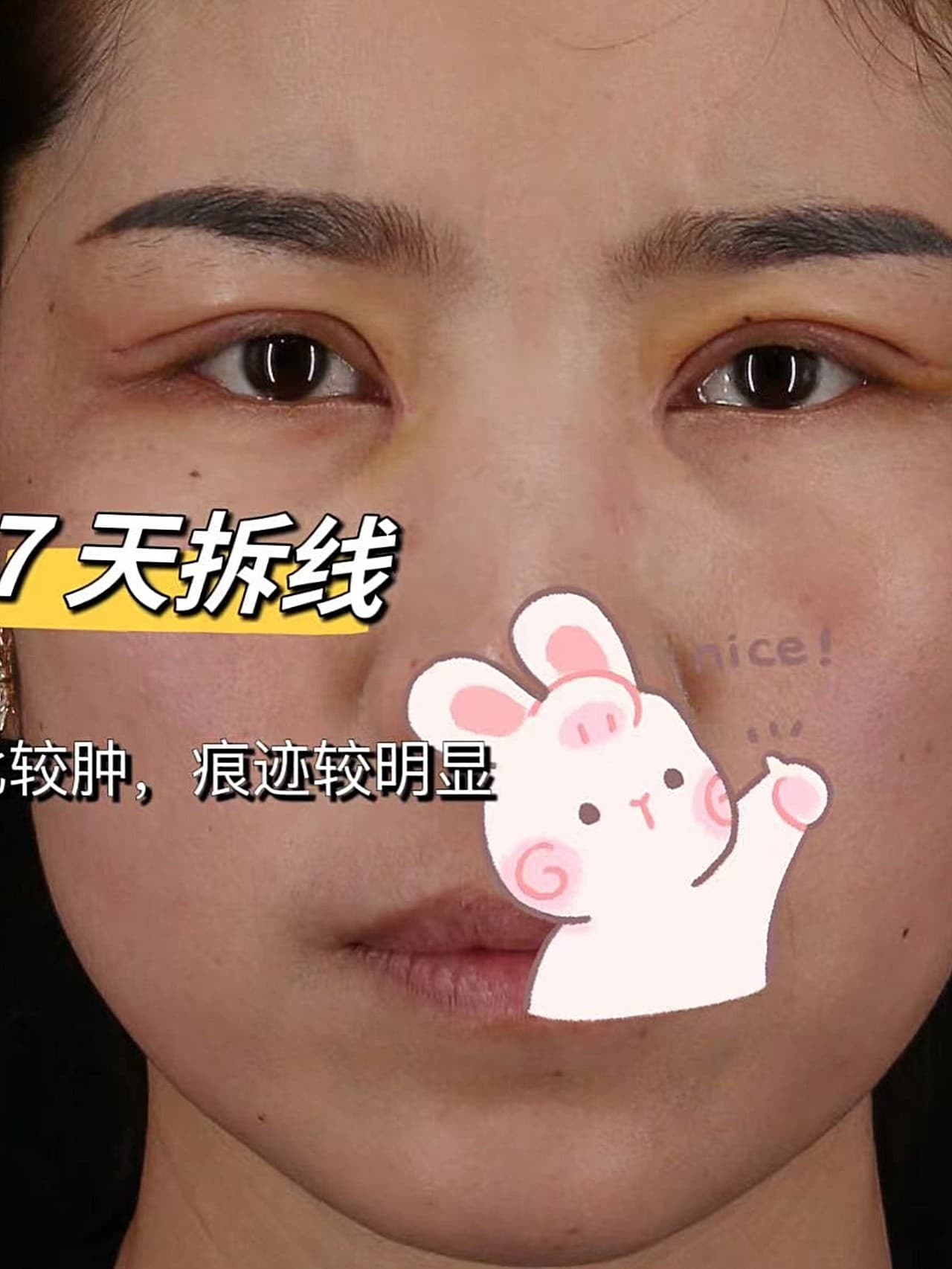 做完前几天真的很肿胀,到一周拆完线,每天的变化都很大,慢慢消肿我都有拍照记录下来,大概两周时间吧,感觉我的眼睛就已经看起来很自然了☺️,现在的眼睛形态和宽度,基本上和面诊沟通时一样,完美还原,点赞何静医生~