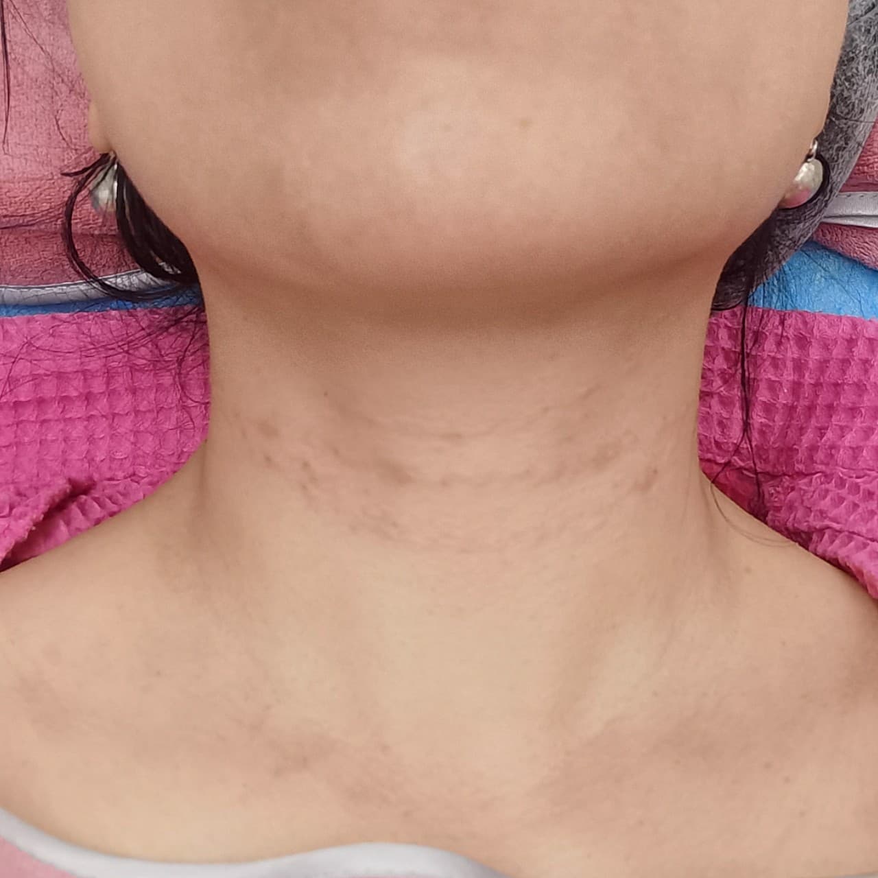 术后即刻暂时还看不到什么效果。脖子上有三条比较明显的红色凸起纹理。等明后天再来看。