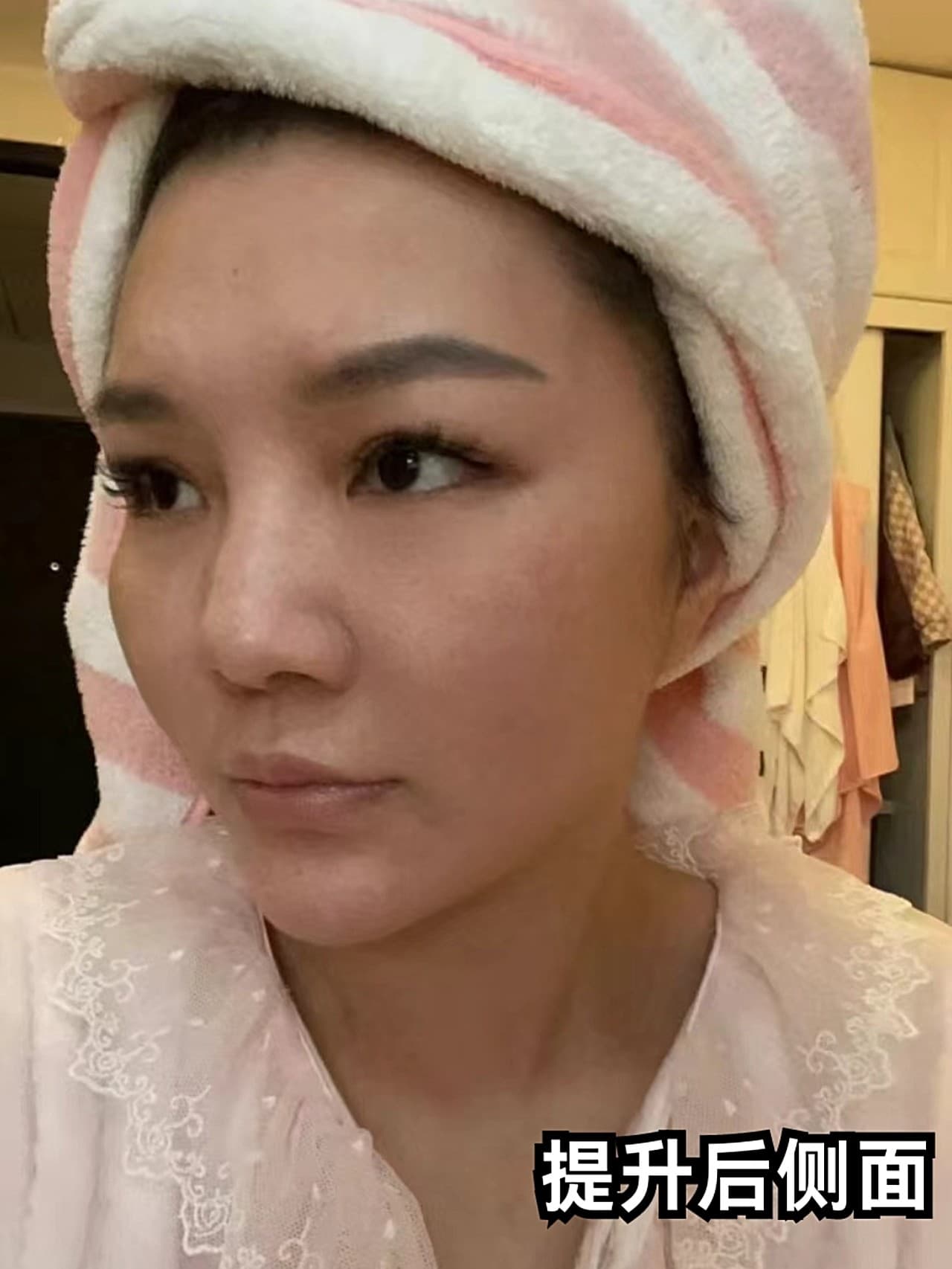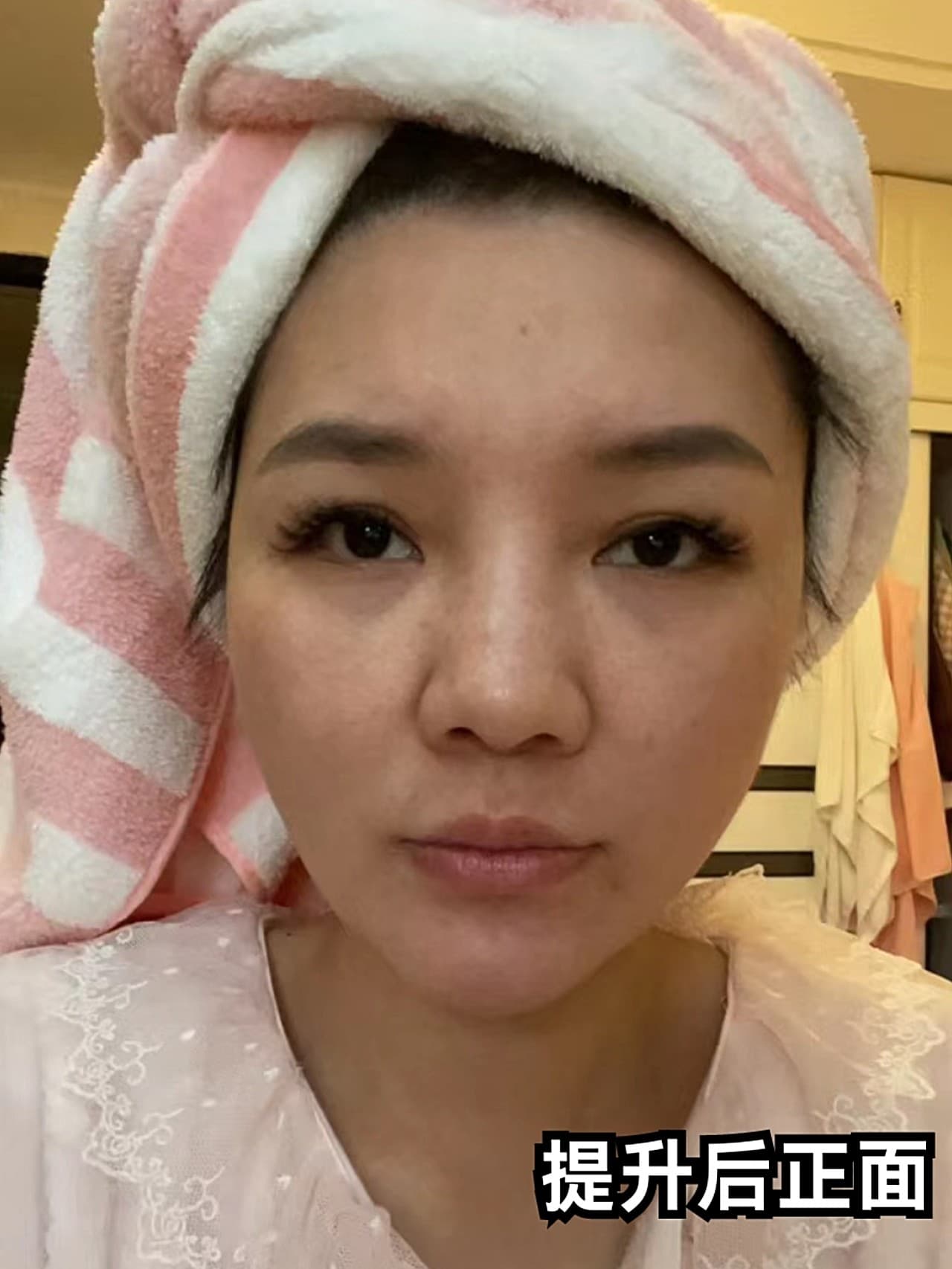 ☀体验后效果:对比可以到皮肤变得紧致了很多,之前松垂下垮的皮肤整体提上去了,做表情也是很自然的状态,脸也小了很多。